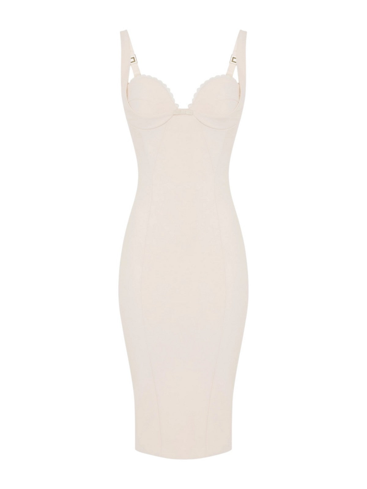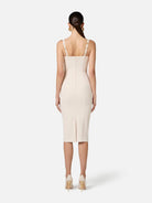 Un capo sofisticato ed elegante, perfetto per occasioni speciali o serate chic. Questo abito midi è realizzato in un tessuto di crêpe stretch, che avvolge delicatamente la silhouette, enfatizzandola con una linea a tubino pulita e raffinata.