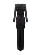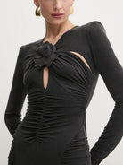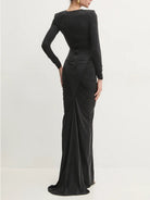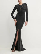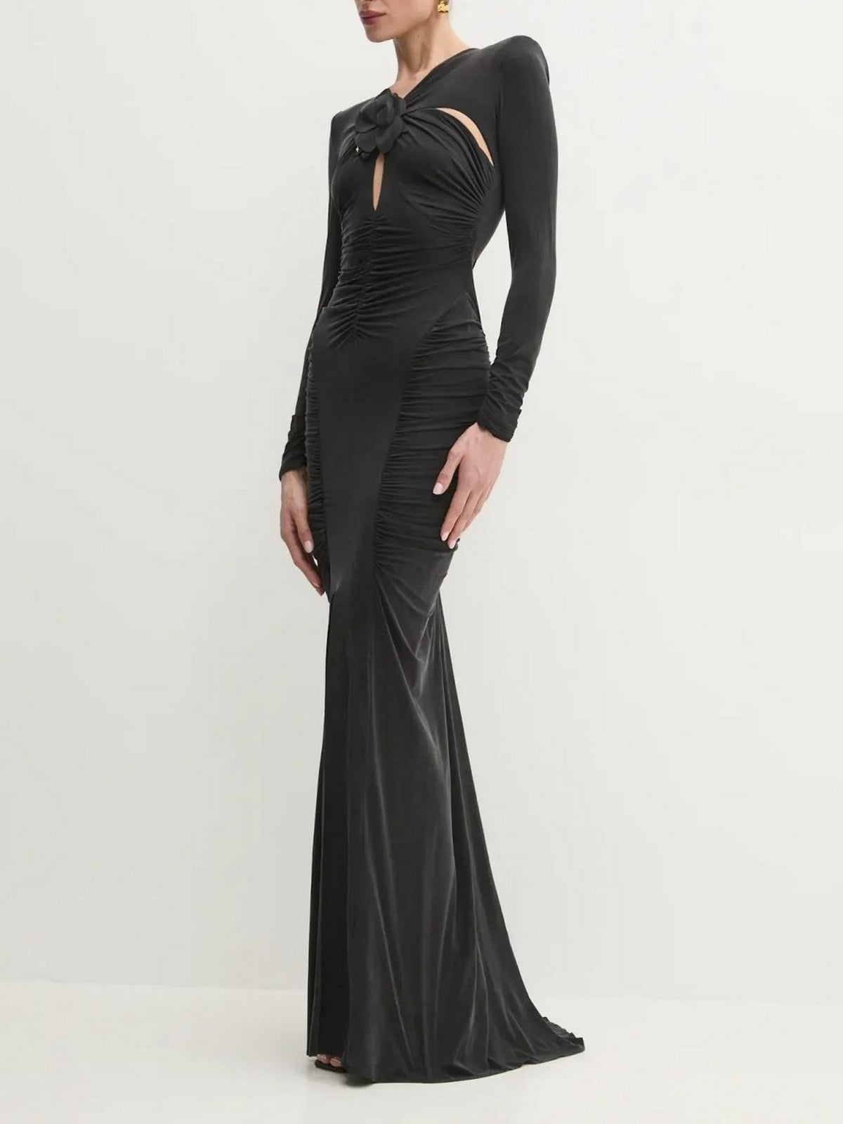 Completa il look con un paio di décolleté nere e una pochette coordinata. L'insieme è perfetto per un evento elegante, combinando raffinatezza e classe in un abito senza tempo.
