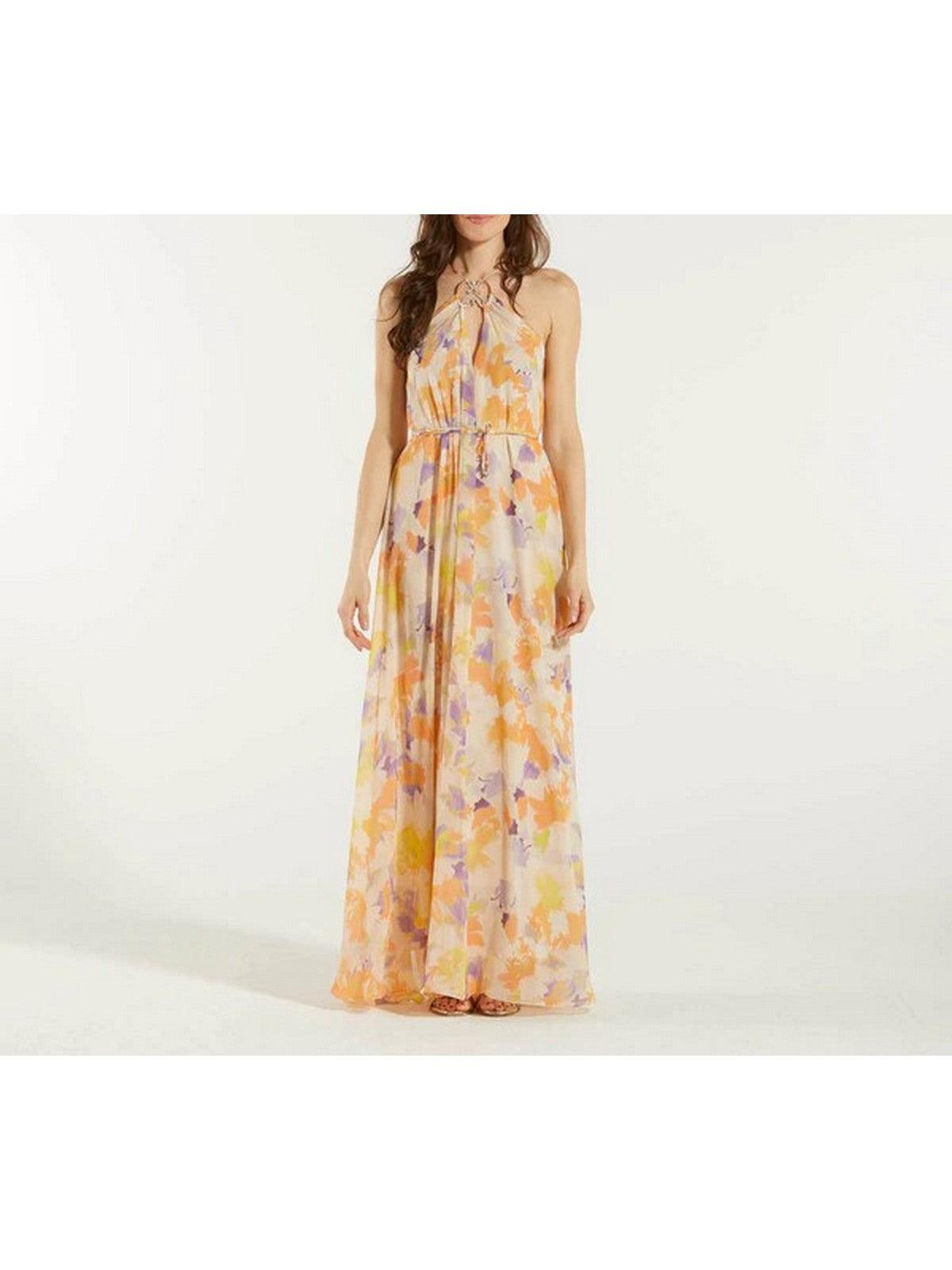 فستان PATRIZIA PEPE طويل من الشيفون مع طبعة زهور يتميز بتفصيل جوهرة Fly على الظهر. خط عنق هالتر.