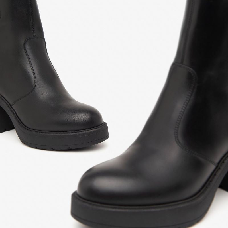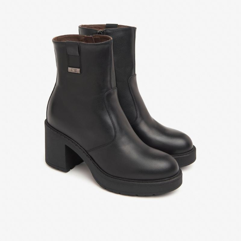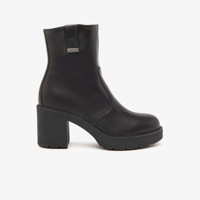 Il tacco largo da 8 cm garantisce slancio e stabilità, mentre la comoda zip laterale facilita la calzata. La tomaia minimal è impreziosita da una piccola placchetta metallica con logo NG, discreta e luminosa. Il fondo in gomma con grip antiscivolo assicura una camminata sicura e confortevole.