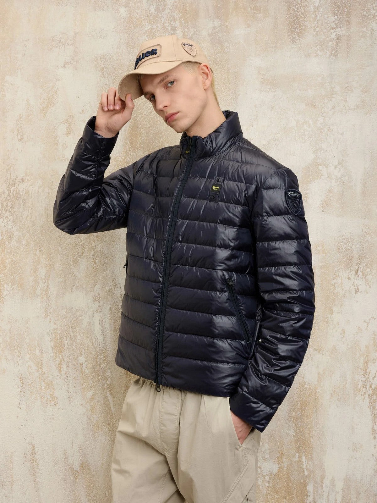 Piumino lucido BLAUER imbottito piuma e impunturato a righe orizzontali. Capo iconico della linea che non può mancare nel guardaroba.