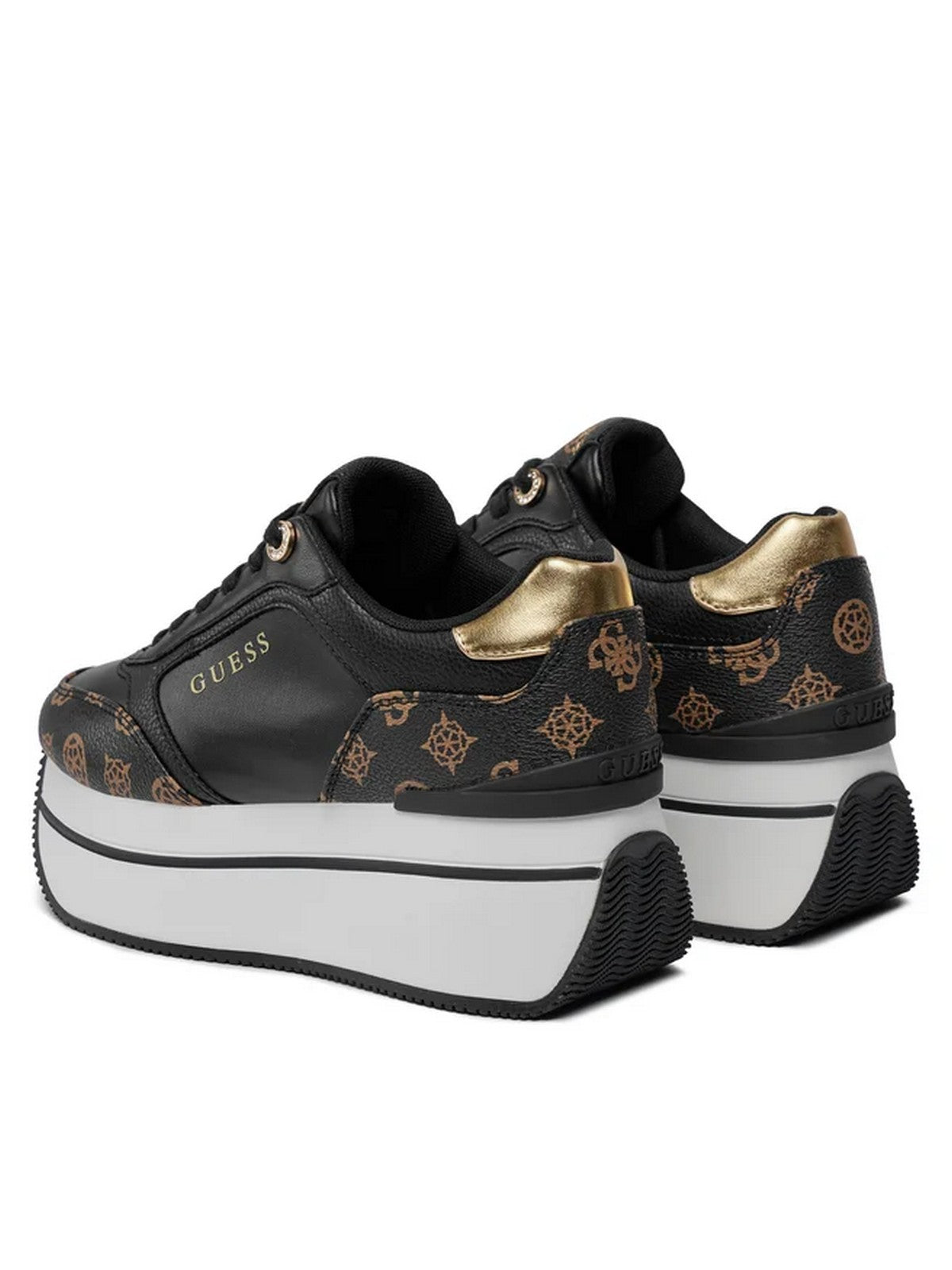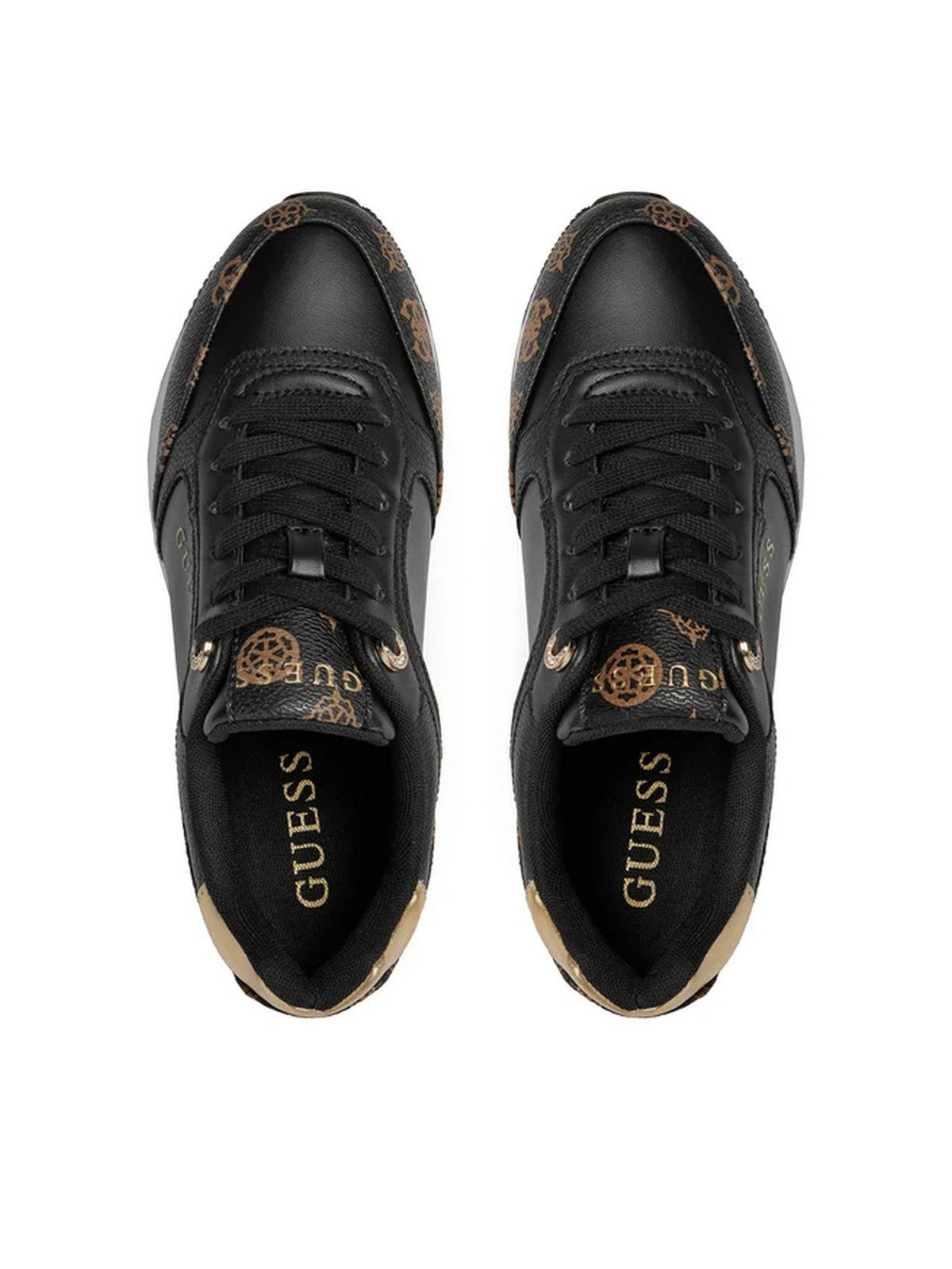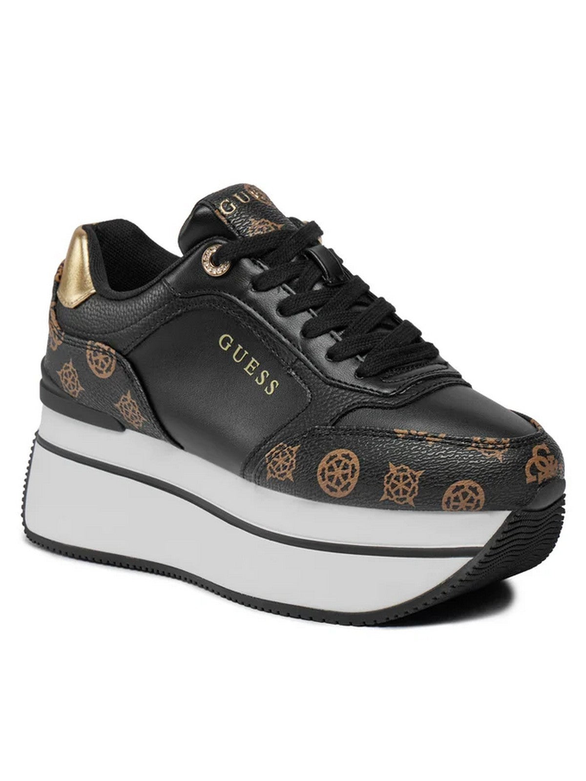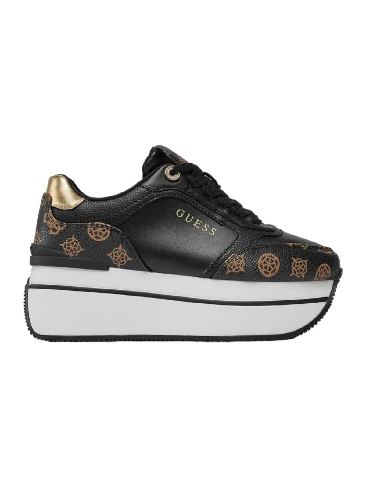 Sneakers GUESS in similpelle con dettagli logati, motivo peony. Inserto laminato sul retro. Punta tonda. Scritta logo frontale, lato e su suola. Sottopiede e fodera interna in tessuto.