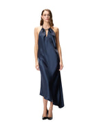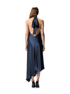 Abito lungo e aderente senza maniche, reso unico dall'orlo asimmetrico e impreziosito da boule in metallo in corrispondenza dello scollo all'americana. Un tocco di sensualità è dato dalla schiena scoperta accarezzata dal drappo legato al collo che cade libero regalando movimento. Il raso lucido conferisce una lucentezza unica e una mano particolarmente morbida al capo. Indossa questo design per un effetto fluido e scivolato che esalta con eleganza e raffinatezza le linee e la silhouette femminile.