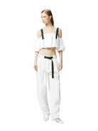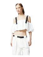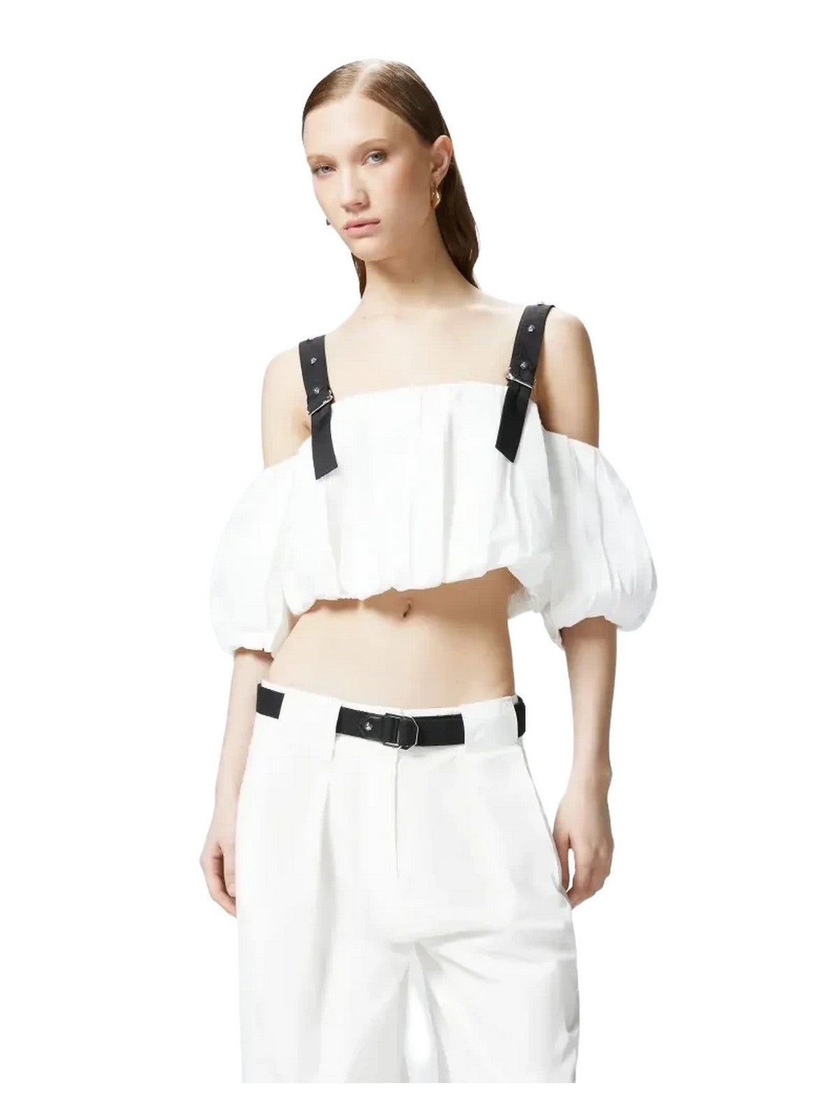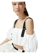 Top dal taglio corto e dal volume a palloncino realizzato in leggero popeline di puro cotone, caratterizzato da scollo dritto off-shoulders che lascia scoperte le spalle per un dettaglio femminile. Lo scollo sensuale è completato da mezze maniche balloon e da spalline regolabili in tessuto tecnico a contrasto con piccole borchie metalliche applicate. Il top con spalle scoperte costruisce look quotidiani dal gusto speciale, indossato con i pantaloni abbinati per un total look che non passa inosservato.