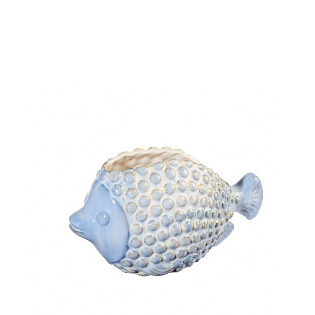 Cache-pot pesce in gres. Ispirazione marina nella forma e nelle sfumature del blu e bianco, per un complemento perfetto per valorizzare consolle o tavolini. Da abbinare al corallo decorativo dell'ispirazione Orizzonti per dettagli d'arredo che interagiscono con impeccabile naturalezza.