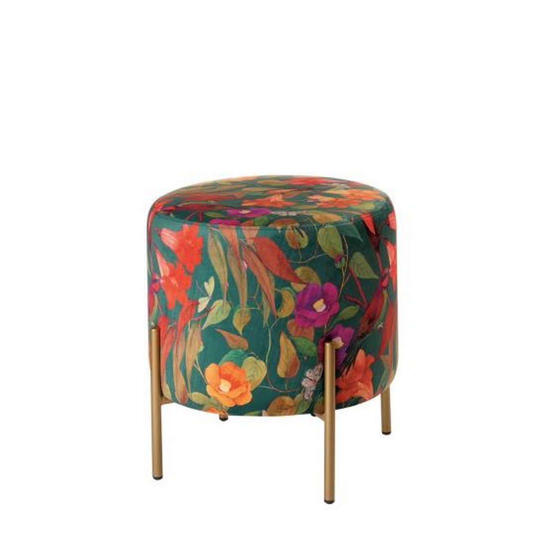 Pouf con struttura in legno e gambe in metallo dorato. Il suo decoro con fiori ed uccelli lo rende perfetto per creare un'atmosfera moderna e chic. Da abbinare alla poltroncina con lo stesso decoro per creare un ambiente dalla personalità vivace ed elegante.