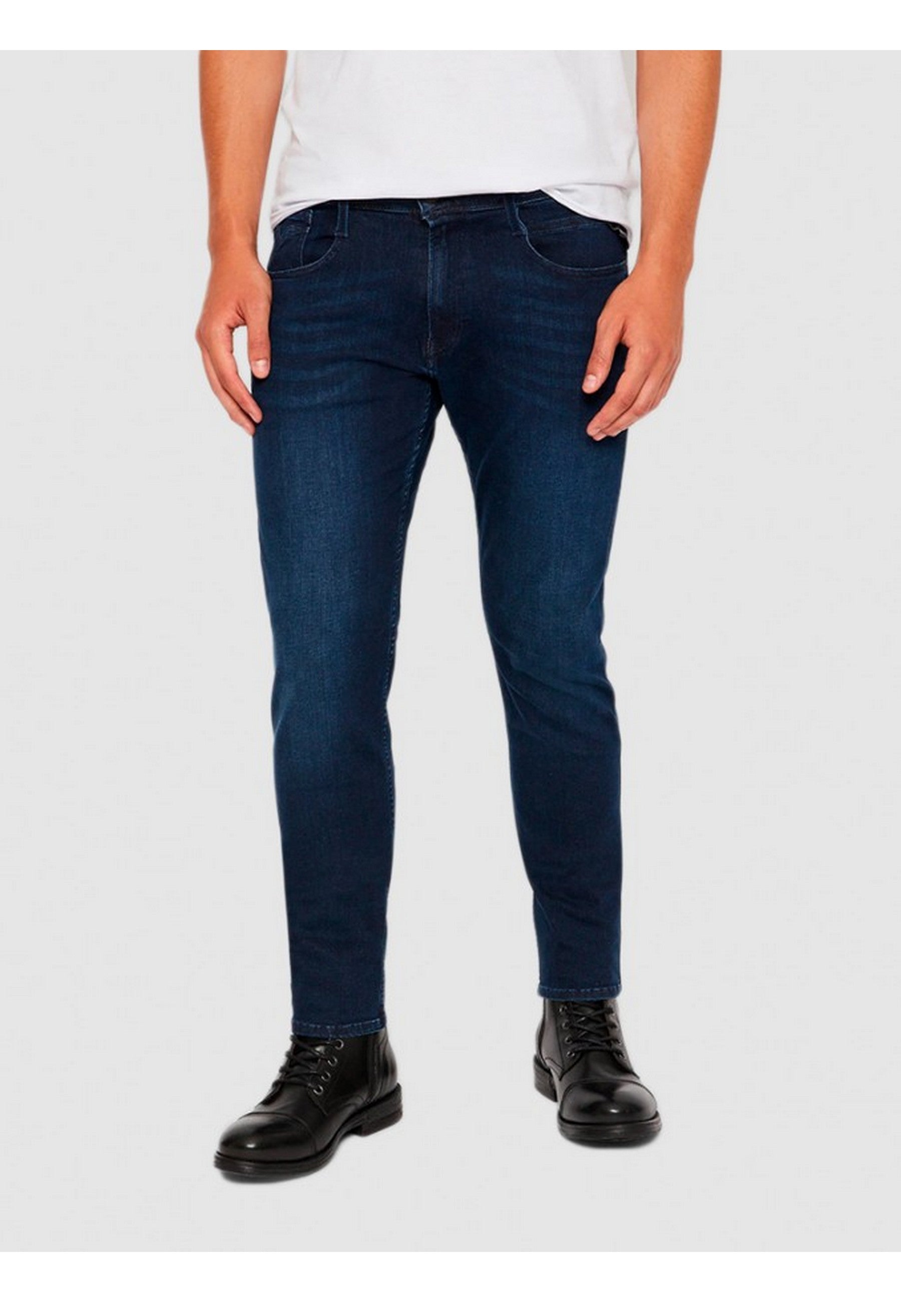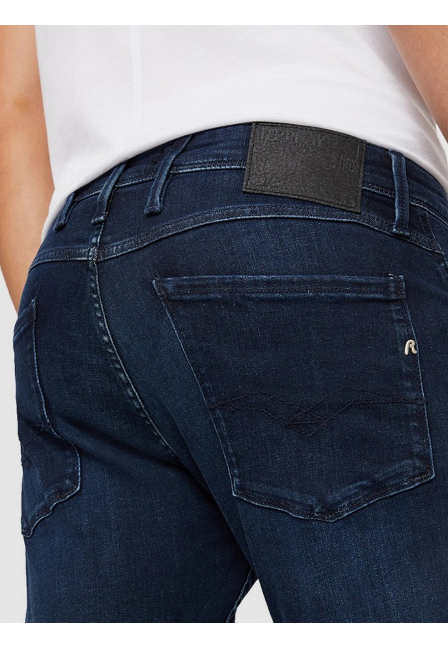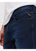 REPLAY jeans in stretch denim, regular waist, skinny leg, five-pocket style, zip and button fastening, embroidered logo on the pocket, dark wash