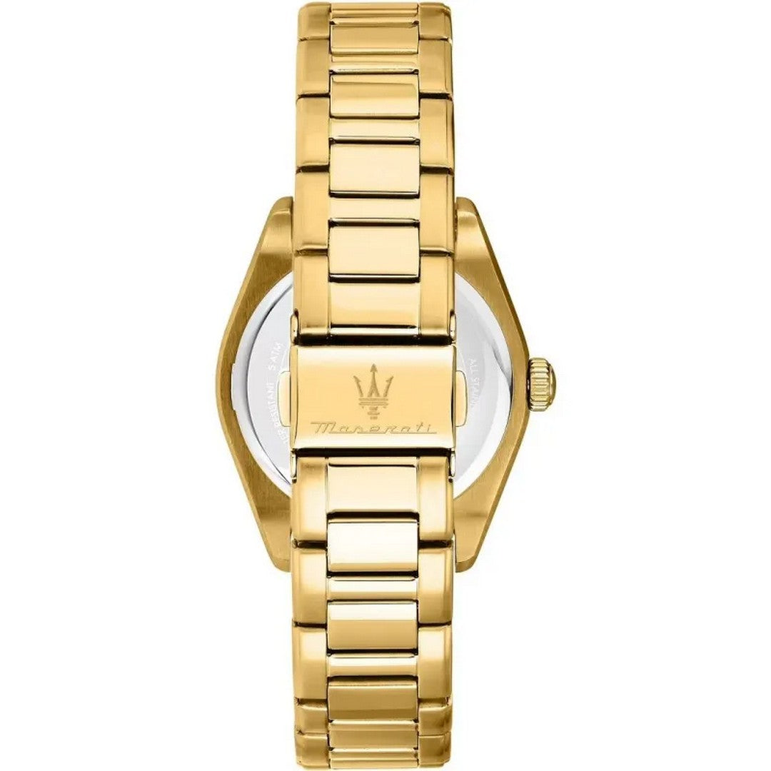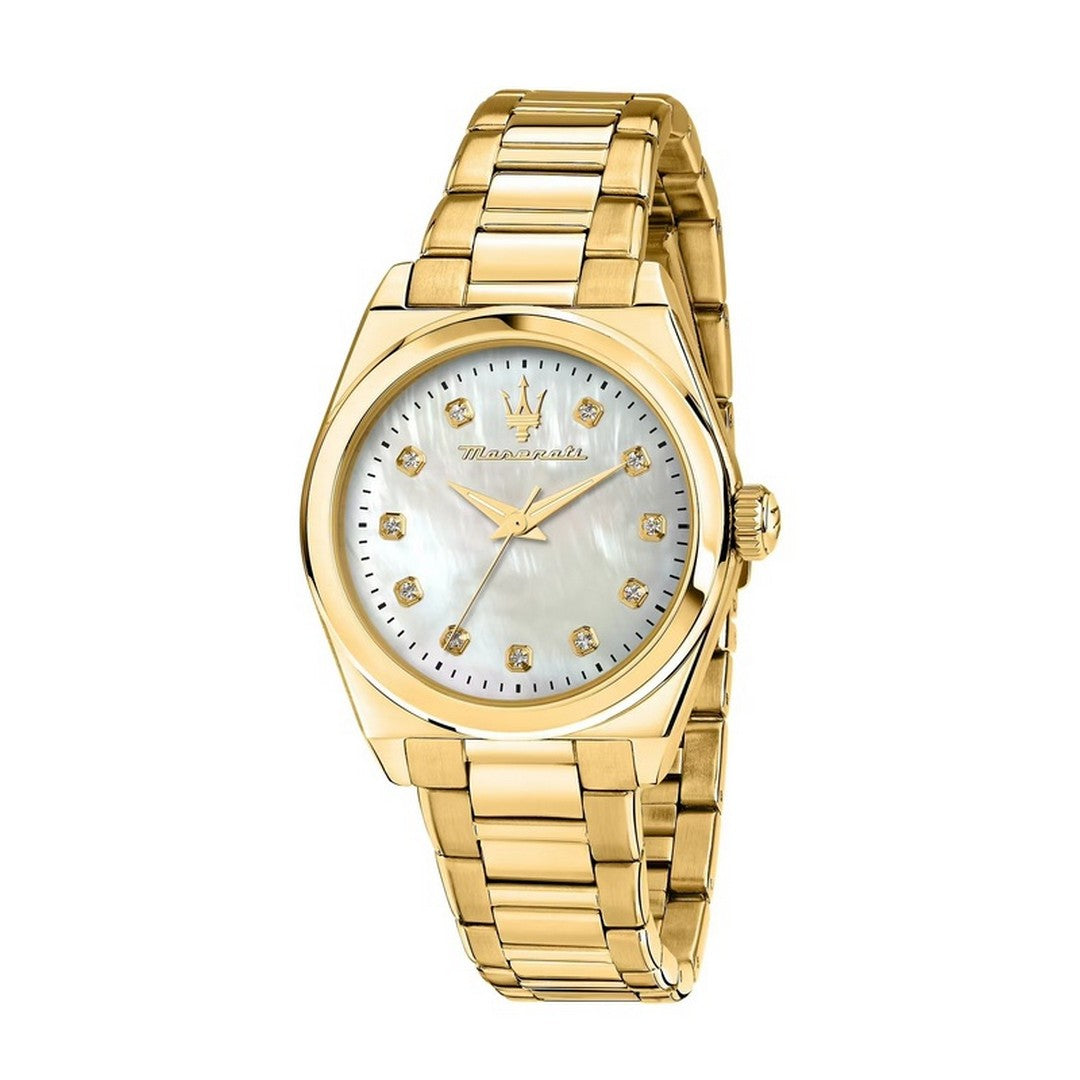 MASERATI women's time-only watch from the VELOCITA' collection with quartz movement, 35 mm gold PVD stainless steel case, 9.00 mm case thickness, white mother-of-pearl analog dial with indexes embellished with luminous white crystals, hands with luminescent insert so that the time is readable even in low light conditions and mineral glass - The strap is gold PVD stainless steel with a polished and satin finish and features a deployant clasp with double push-button opening - Watch water resistant to 5 ATM - International Warranty: 24 Months