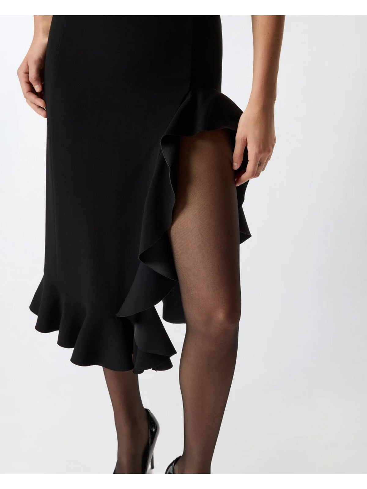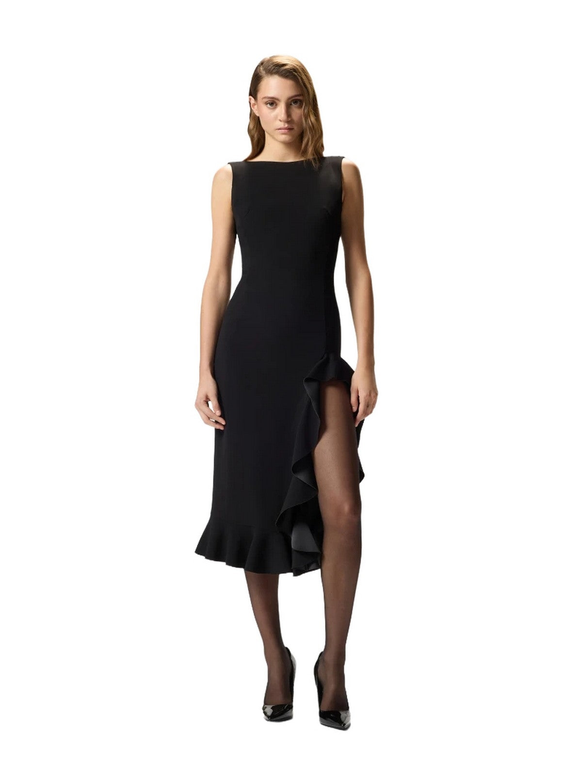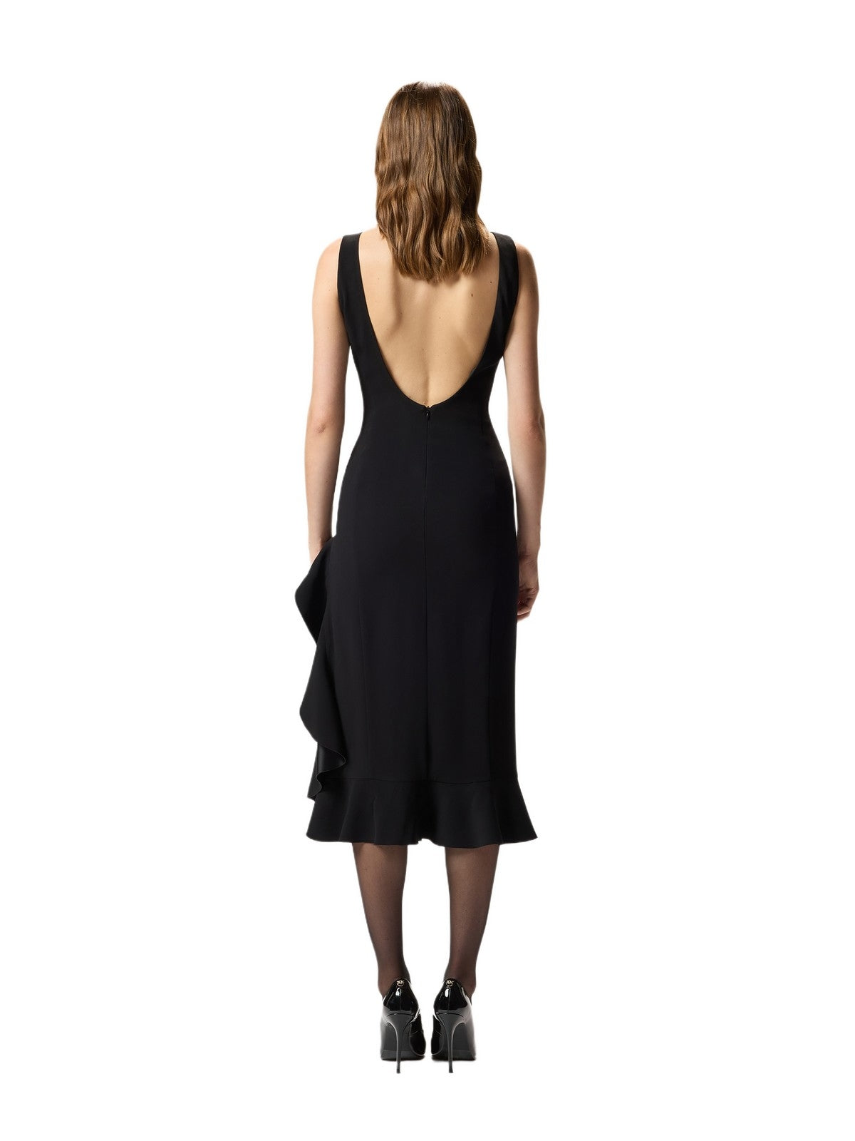 Abito lungo senza maniche con scollo profondo sul retro, realizzato in tessuto di viscosa elasticizzata, che si traduce in una vestibilità ottimale. Il materiale è progettato per aderire perfettamente alle linee del corpo, esaltando la silhouette in modo naturale e definito. I volant a chiocciola laserati e accoppiati con raso creano un contrasto di lucido e opaco che esalta la texture del tessuto. Il mix di forme dona movimento a questo look raffinato, senza perdere un effetto finale strutturato e femminile.