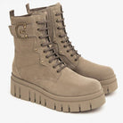 The suede upper softly envelops the foot, while the internal zip allows for a quick and easy fit. The lace-up front closure, inspired by military boots, completes a bold and feminine look.