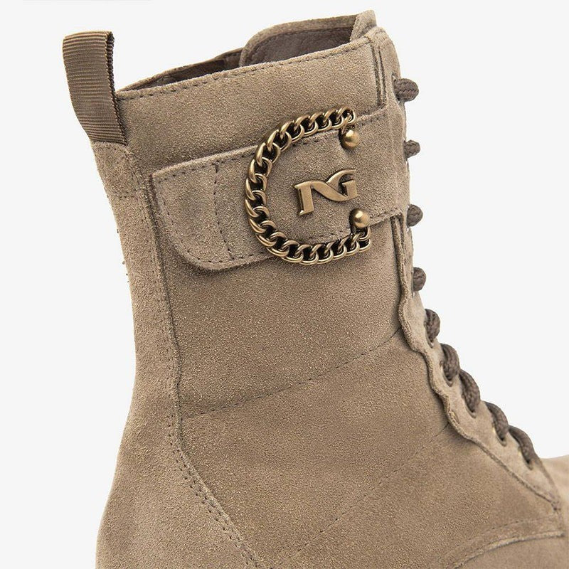 Urban grit and Italian elegance meet in the NeroGiardini I411920D ankle boot, a modern combat boot in refined dove gray suede. The bold, on-trend design is embellished with a decorative gold chain featuring the NG logo on the outside, a detail that adds character and a sophisticated glam-rock style.