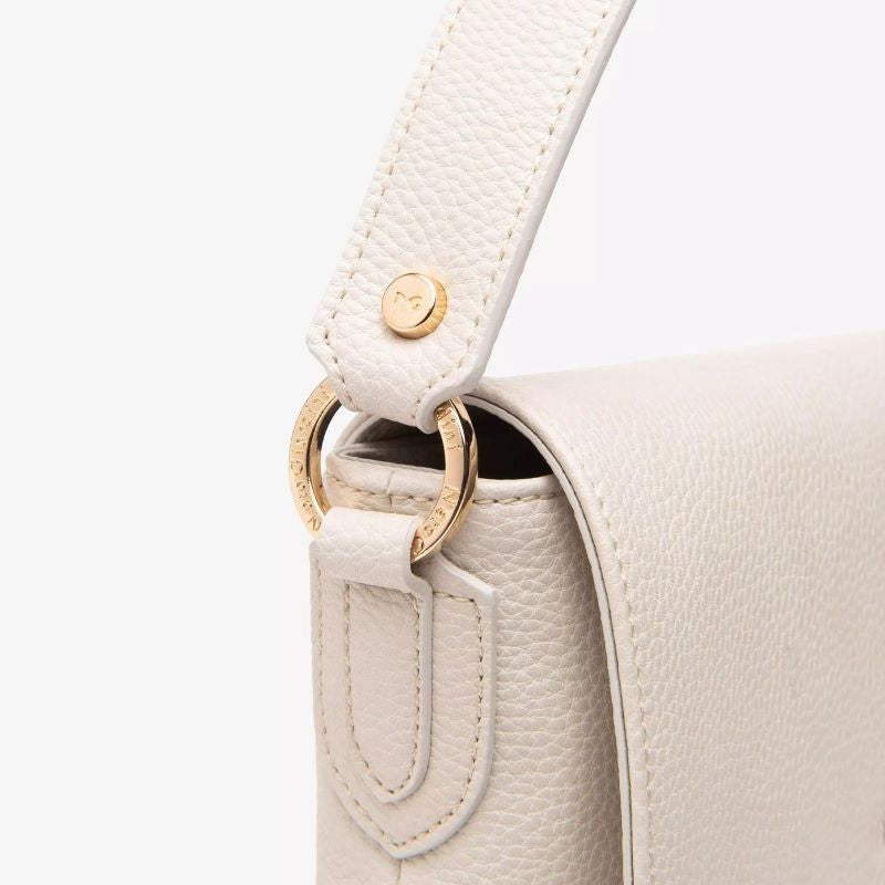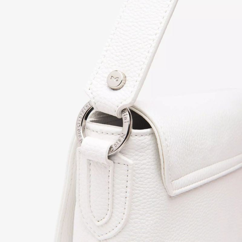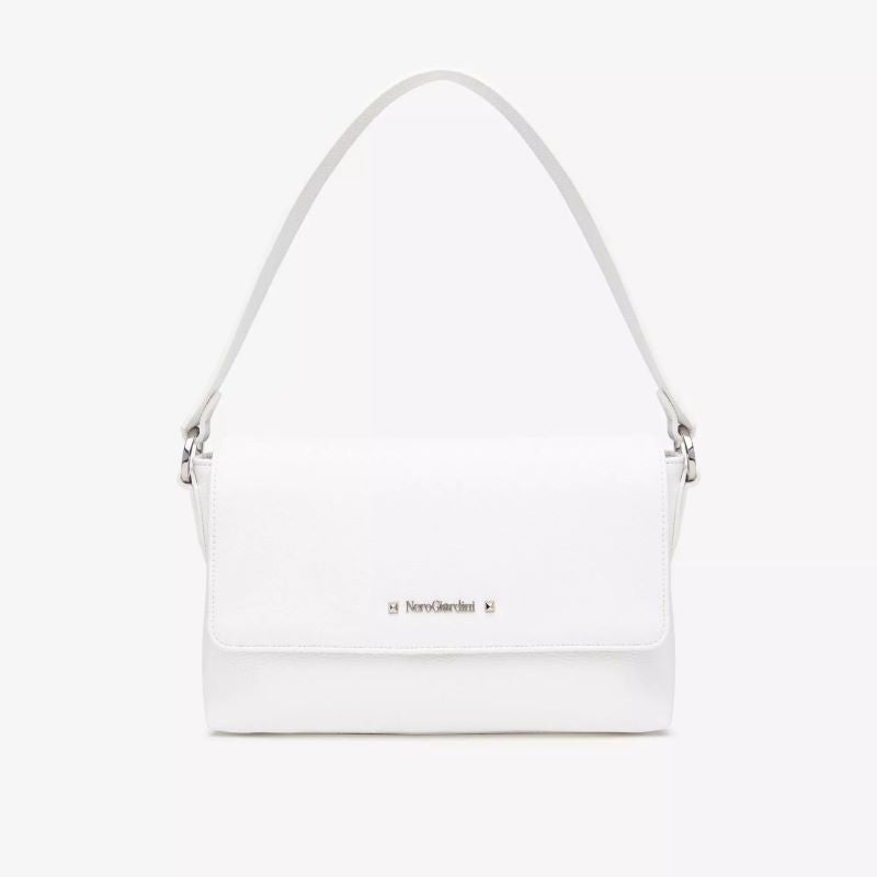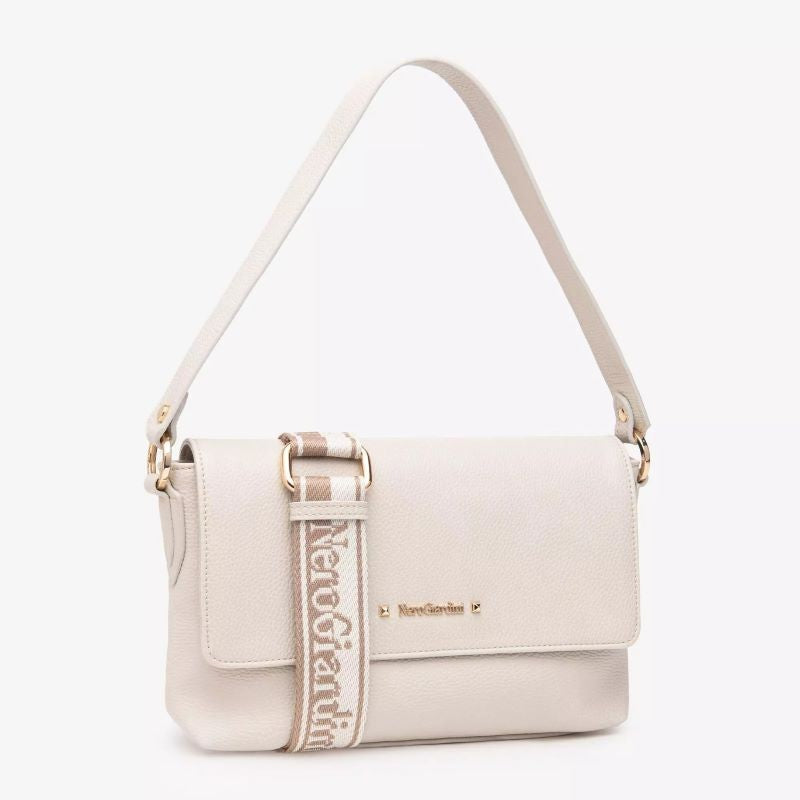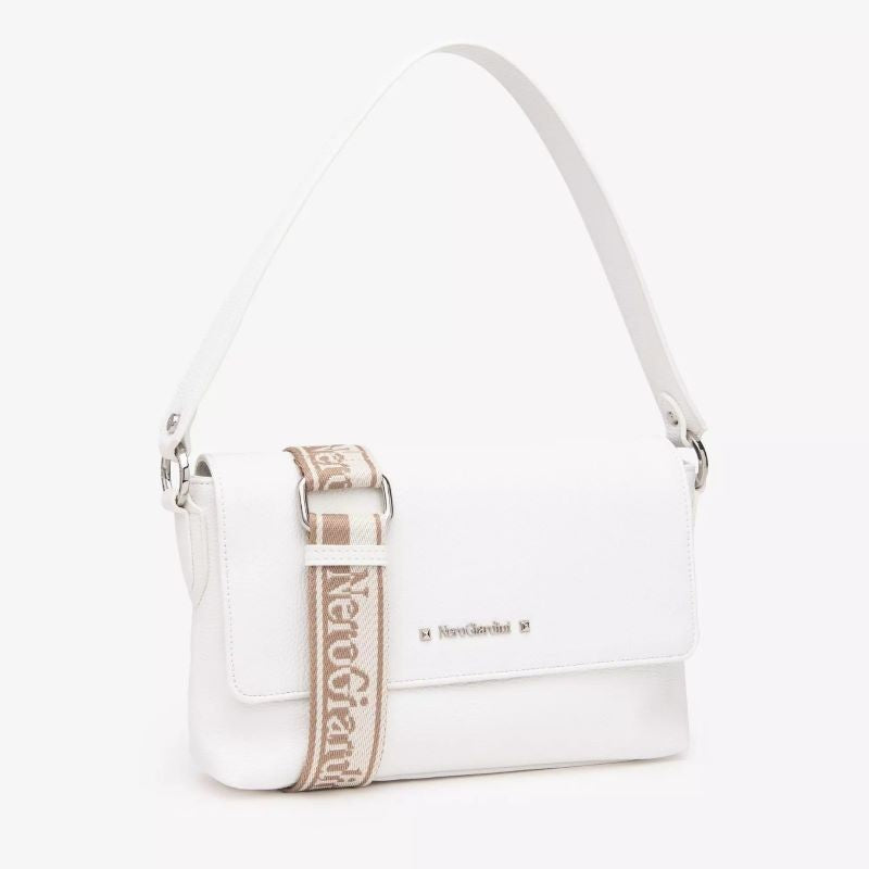 The NeroGiardini, nicknamed "Gorgona," is a shoulder bag with a refined and contemporary silhouette. Crafted from a milky white technical material with ivory trim, it combines versatility and sophisticated style. The clean design is complemented by a front flap with magnetic closure, providing convenient and secure access to the bag's contents.