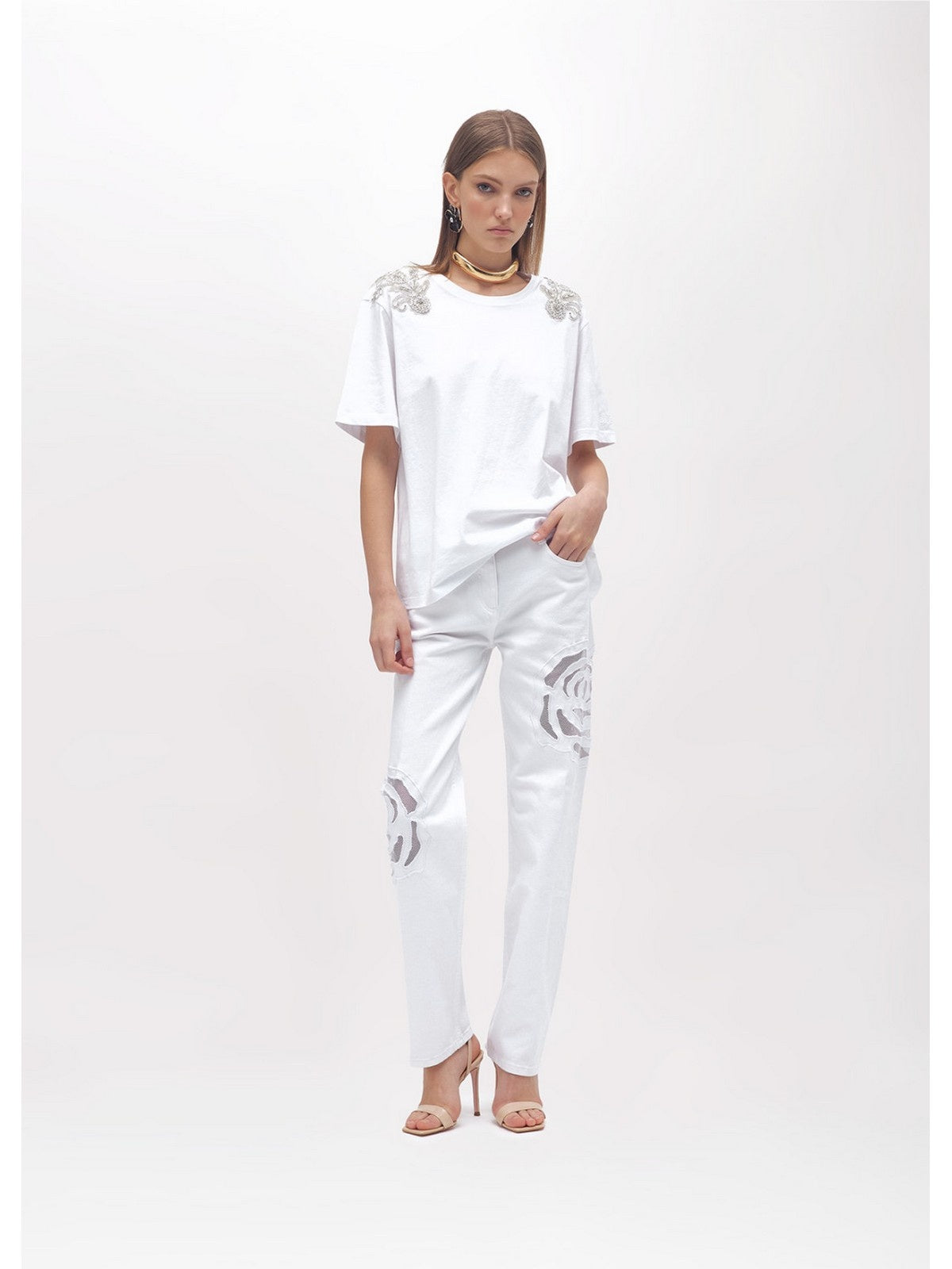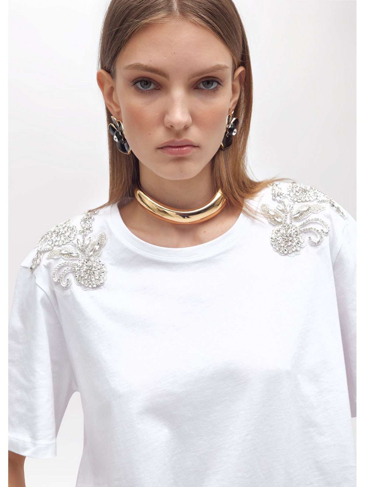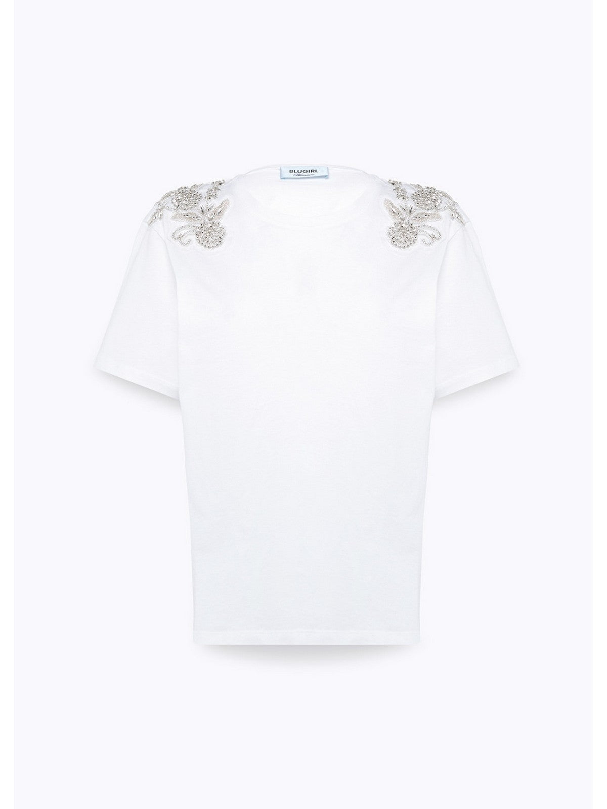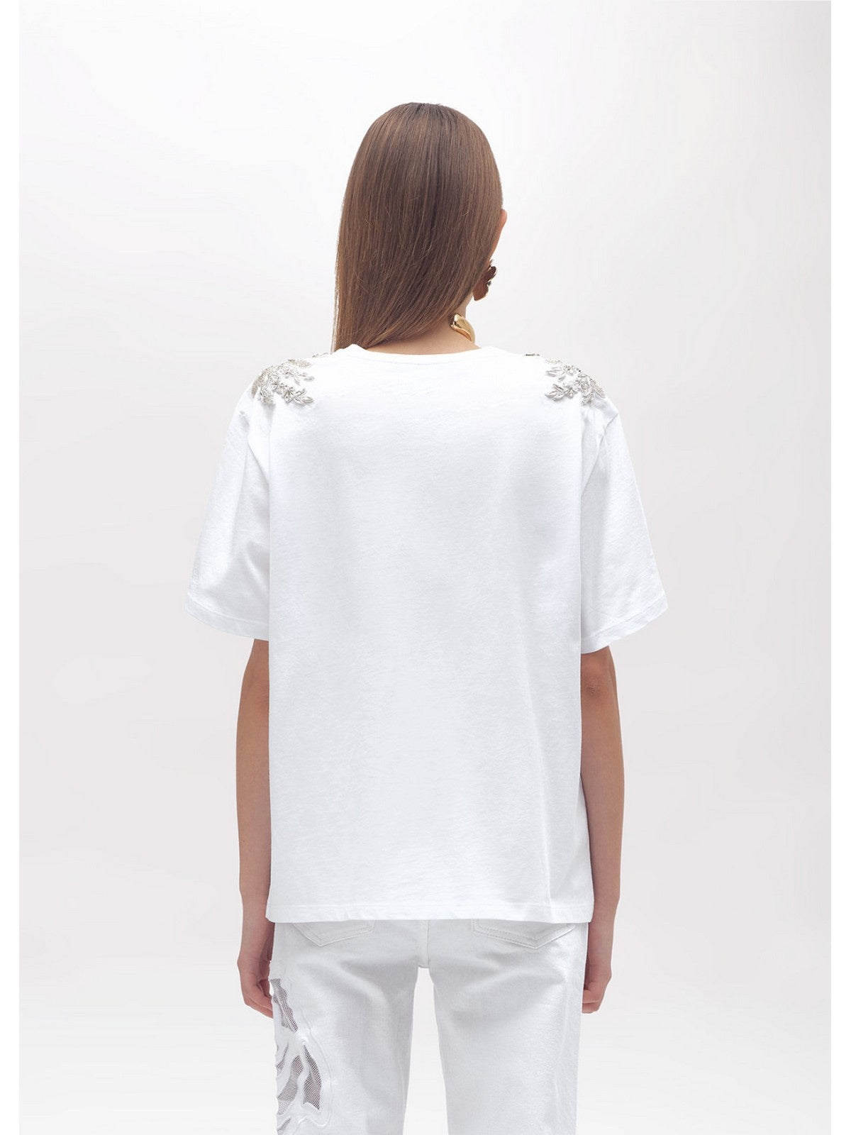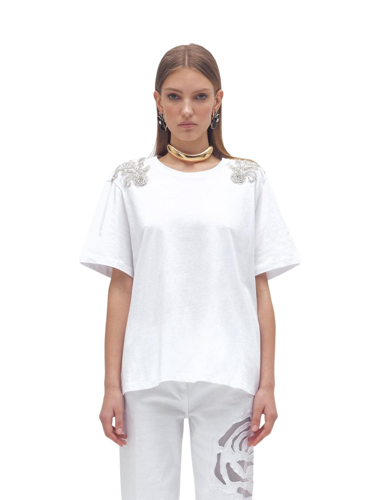 THE GLAMOURFUL SIDE OF EASYWEAR: COTTON JERSEY T-SHIRT WITH EMBROIDERED PATCHES ON THE SHOULDER WITH BEADS AND CRYSTALS ON TULLE, ROUND NECK, SHORT SLEEVES WITH DROPPED SHOULDERS, REGULAR FIT. PERFECT FOR ELEVATING ALL CASUAL OUTFITS, BUT ALSO AS THE BASE FOR YOUR PARTY LOOKS. COMPOSITION: 100% COTTON