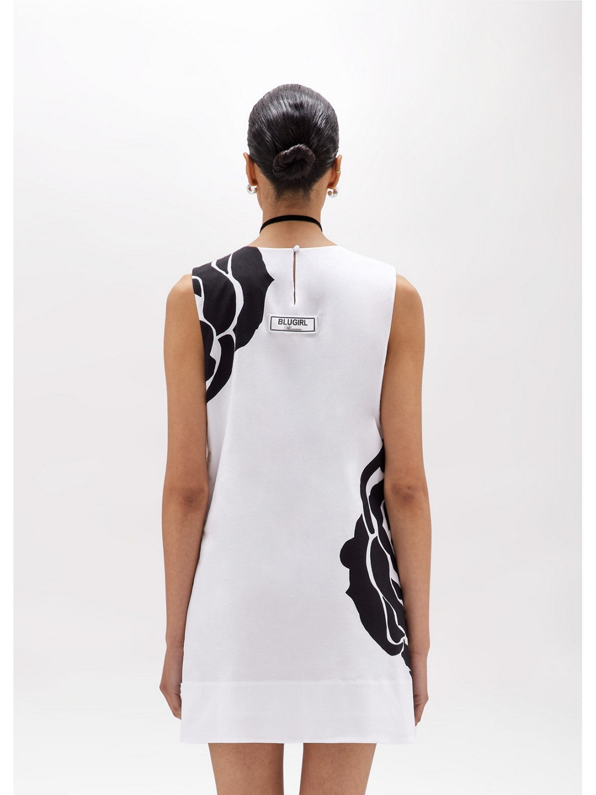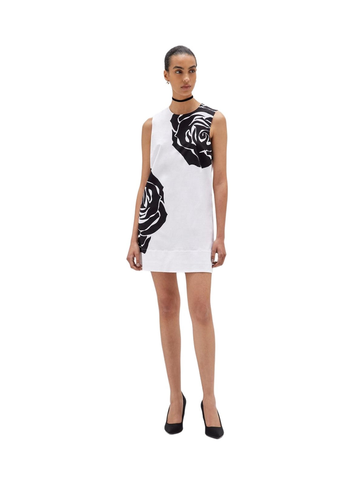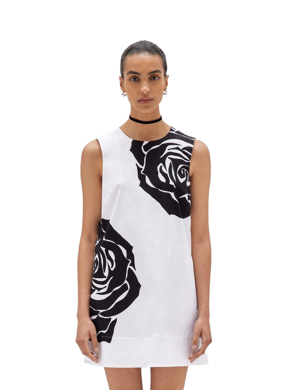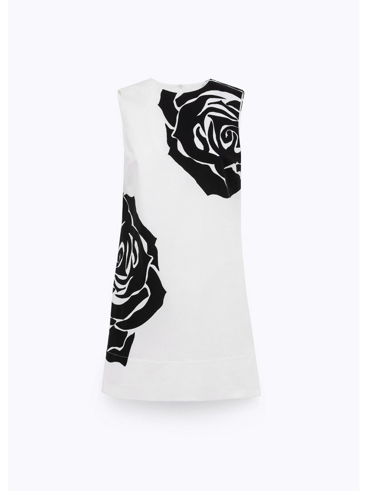 THE DRESS THAT WILL MAKE YOUR DAY. CHOOSE THIS MINI DRESS IN STRETCH COTTON POPLIN WITH A MAXI ROSE PRINT ON THE FRONT. IT HAS A ROUND NECK, WIDE SHOULDERS, A KEY-SHAPED BUTTONED BACK, A LOGO LABEL, A HIGH HEM, AND A SLIGHTLY FLARED LINE. PERFECT FOR THE SILHOUETTE, COMPLETE WITH YOUR FAVORITE ACCESSORIES. COMPOSITION: 97% COTTON 3% ELASTANE