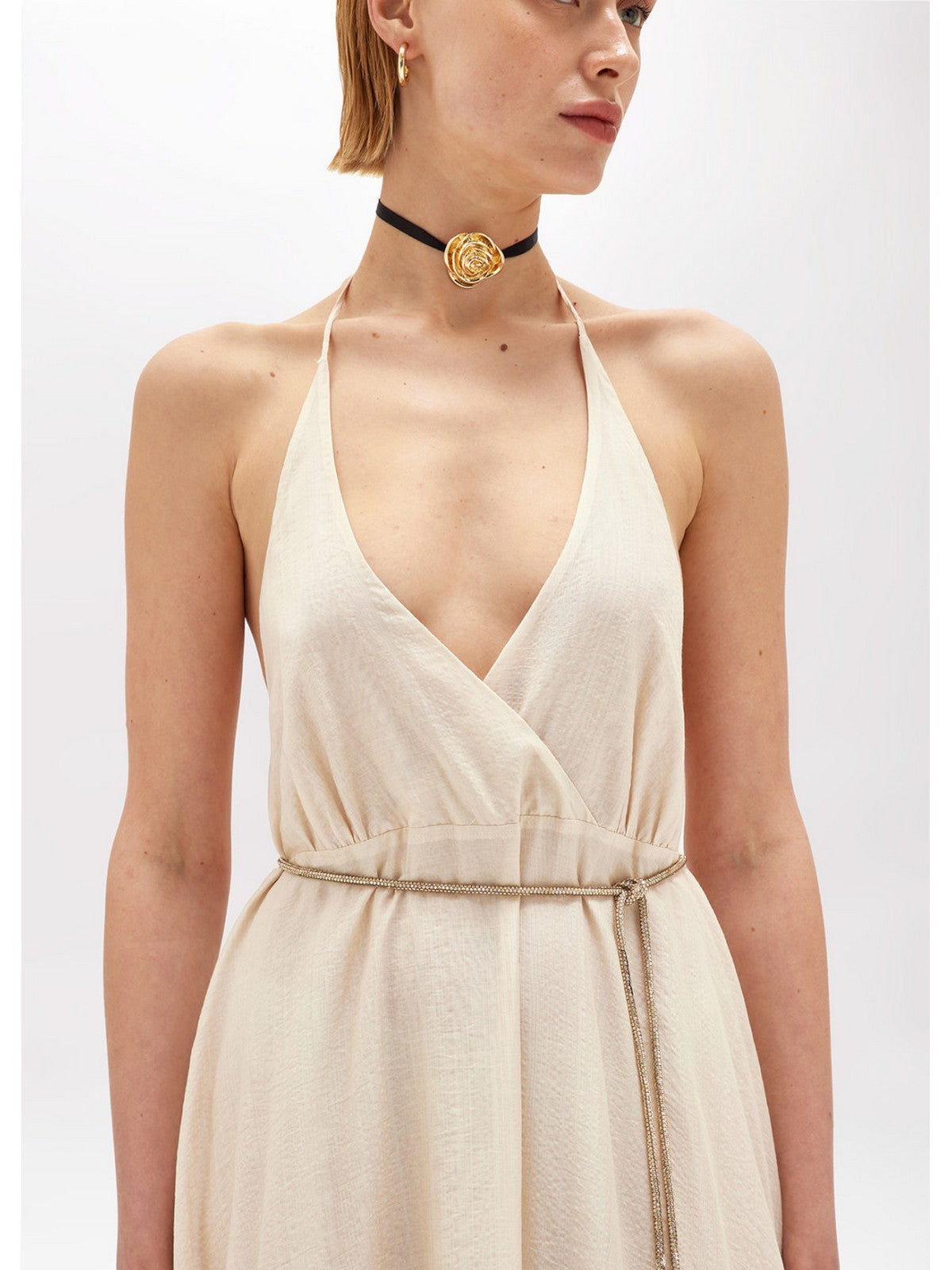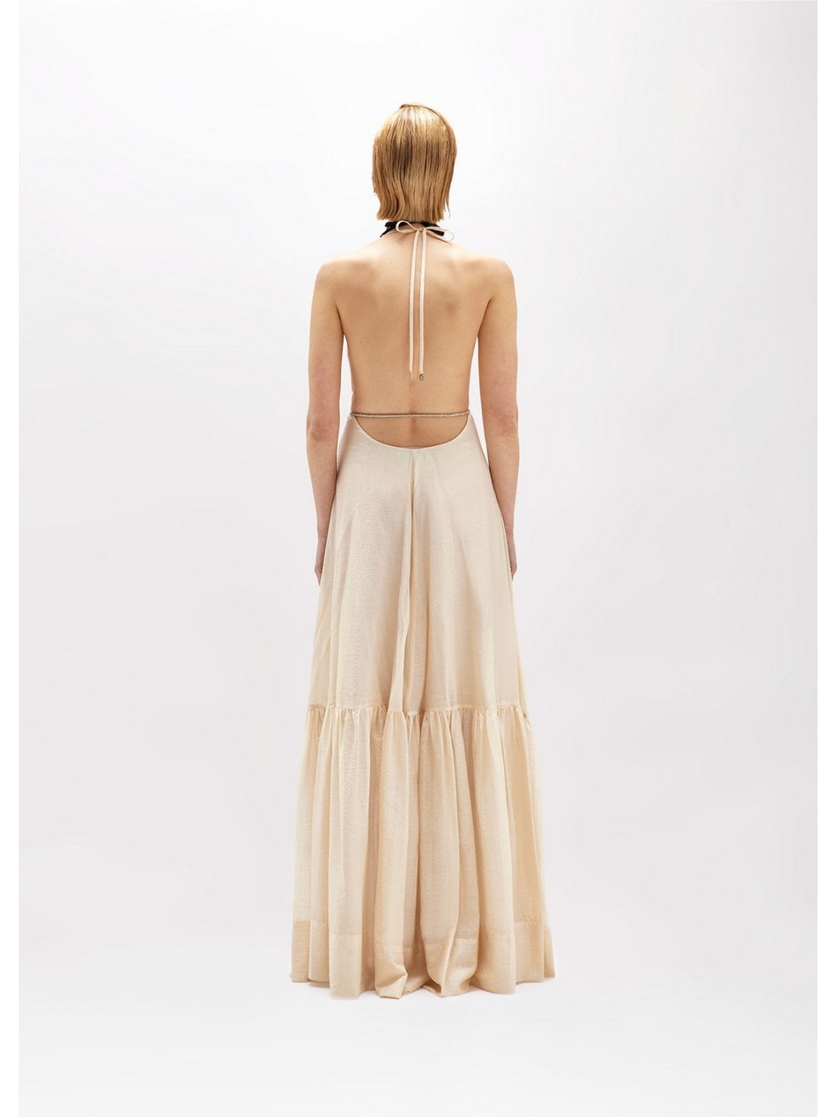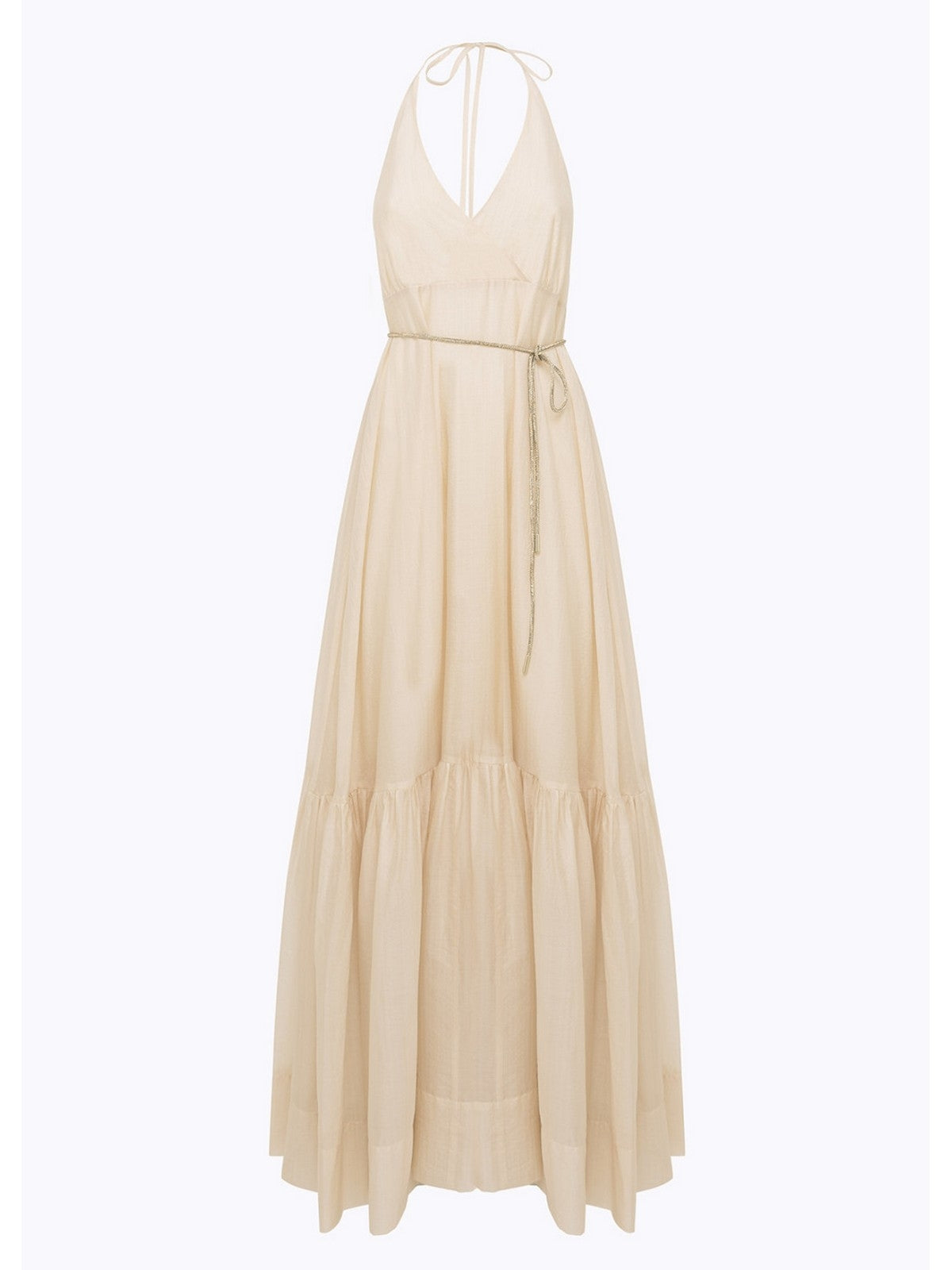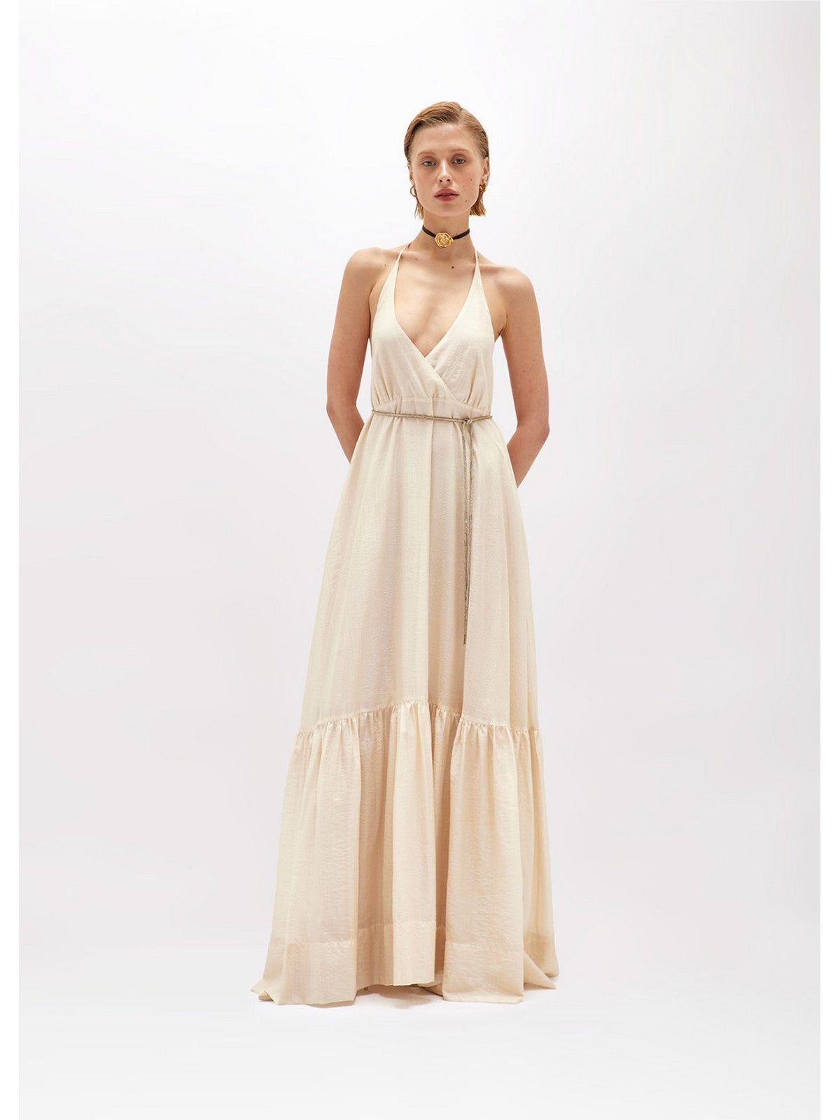 FRESH AND FEMININE, THIS LONG DRESS IN LIGHTWEIGHT TENCEL WITH A RHINESTONE TUBULAR BELT COVERED IN TULLE. IT HAS A Plunging Neckline With A Crossover At The Front, Thin Shoulder Straps, A Gathered Ruffle At The Hem, A Plunging Back, And A Soft Fit. PERFECT FOR SUMMER EVENINGS. COMPOSITION: 80% LYOCELL 20% POLYAMIDE