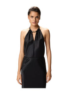 Top morbido senza maniche con scollo all'americana impreziosito da boule di metallo. Un tocco di sensualità è dato dalla schiena scoperta accarezzata dala fusciacca legata al collo che cade libera regalando movimento. Il raso lucido conferisce una lucentezza unica e una mano particolarmente morbida al capo. Indossa questo top per un effetto fluido e scivolato che esalta con eleganza e raffinatezza le linee e la silhouette femminile.