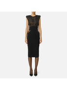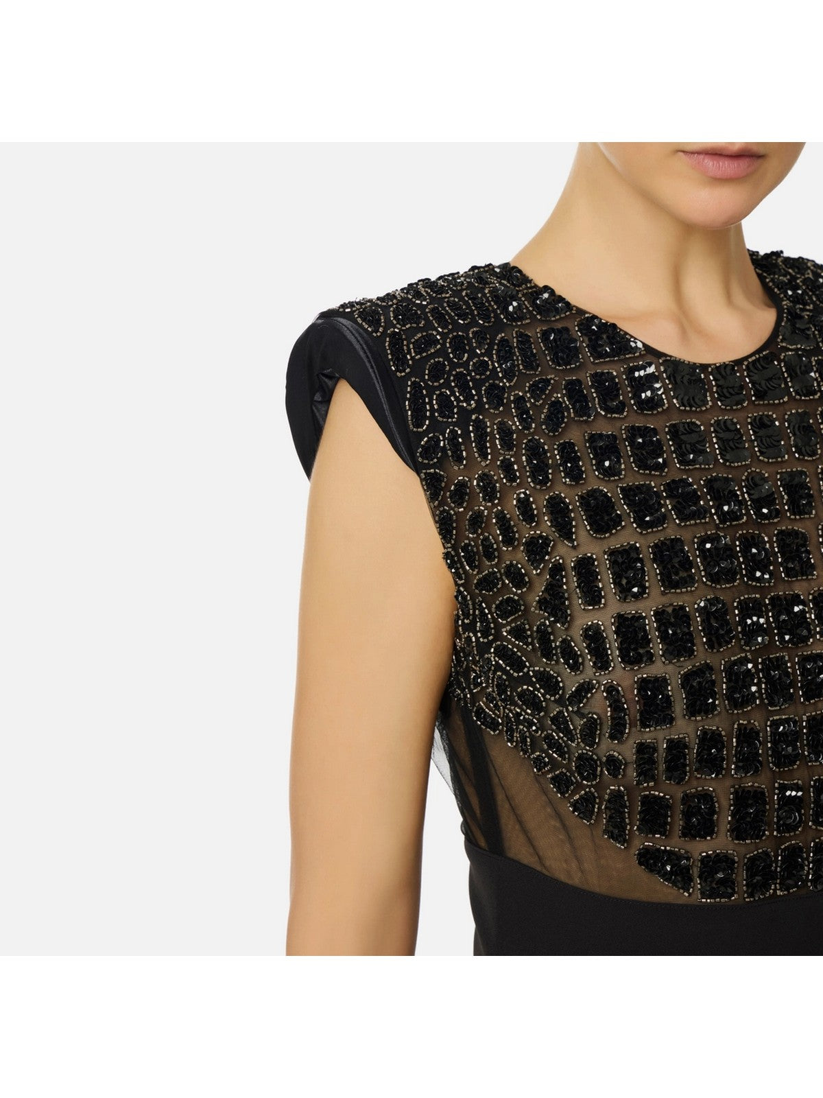 Abito midi ELISABETTA FRANCHI in crêpe leggero, top impreziosito da brillanti ricami con disegno cocco.