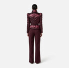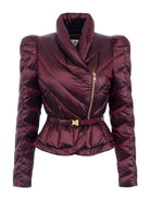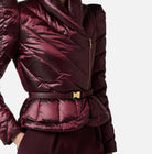 Piumino corto ELISABETTA FRANCHI in tessuto vela dalla luminosa texture cangiante. Imbottito e trapuntato con motivi chevron, si distingue per il collo alto sovrapposto e per le maniche con spalle bombate dai leggeri motivi di arricciatura. La baschina definita dalla cintura con fibbia esalta la linea femminile del capo.