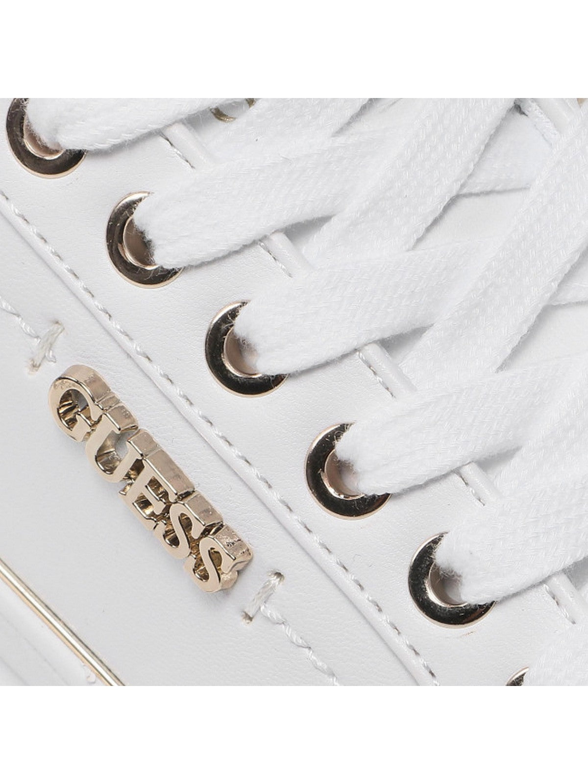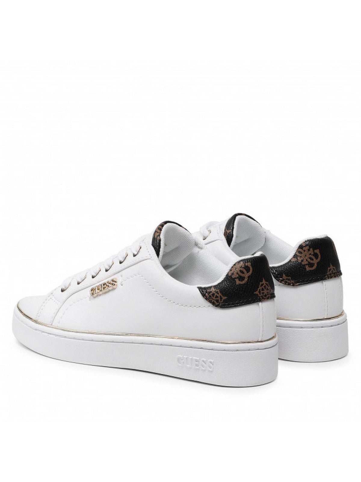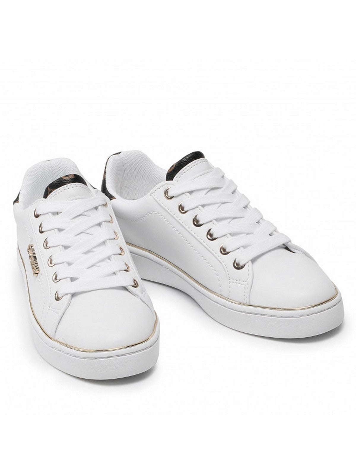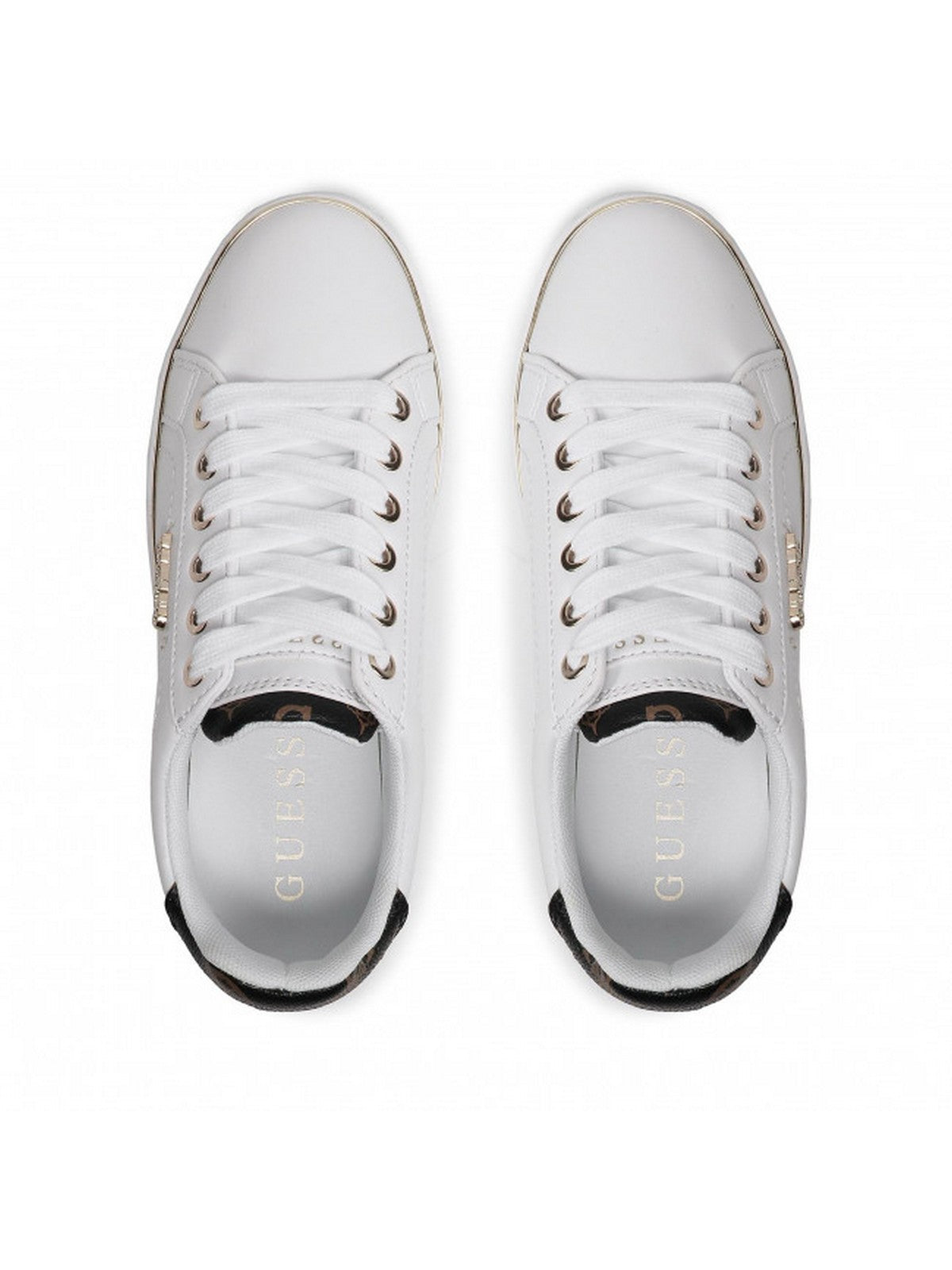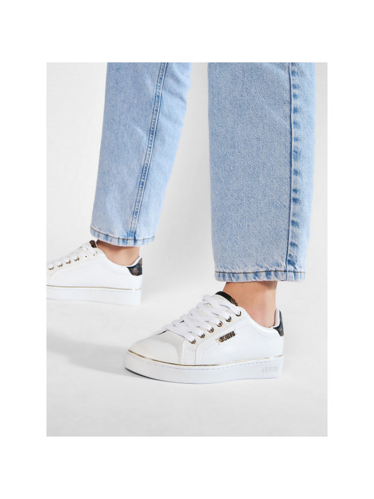 Sneakers GUESS in similpelle bianca, scritta logo in metallo laterale. Dettaglio tallone a contrasto di colore. Chiusura con lacci bianchi. Punta arrotondata.