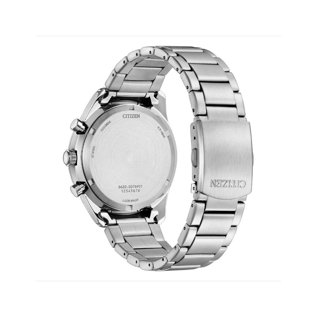 Movimento Eco Drive calibro B620 con riserva di carica di 270 giorni, cronografo e data.