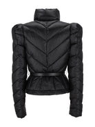 Piumino corto ELISABETTA FRANCHI in tessuto vela dalla luminosa texture cangiante. Imbottito e trapuntato con motivi chevron, si distingue per il collo alto sovrapposto e per le maniche con spalle bombate dai leggeri motivi di arricciatura. La baschina definita dalla cintura con fibbia esalta la linea femminile del capo.