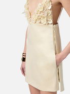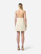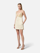 Completa il look con un paio di sandali dorati e una pochette coordinata. L'insieme è perfetto per un evento elegante, combinando raffinatezza e classe in un abito senza tempo.