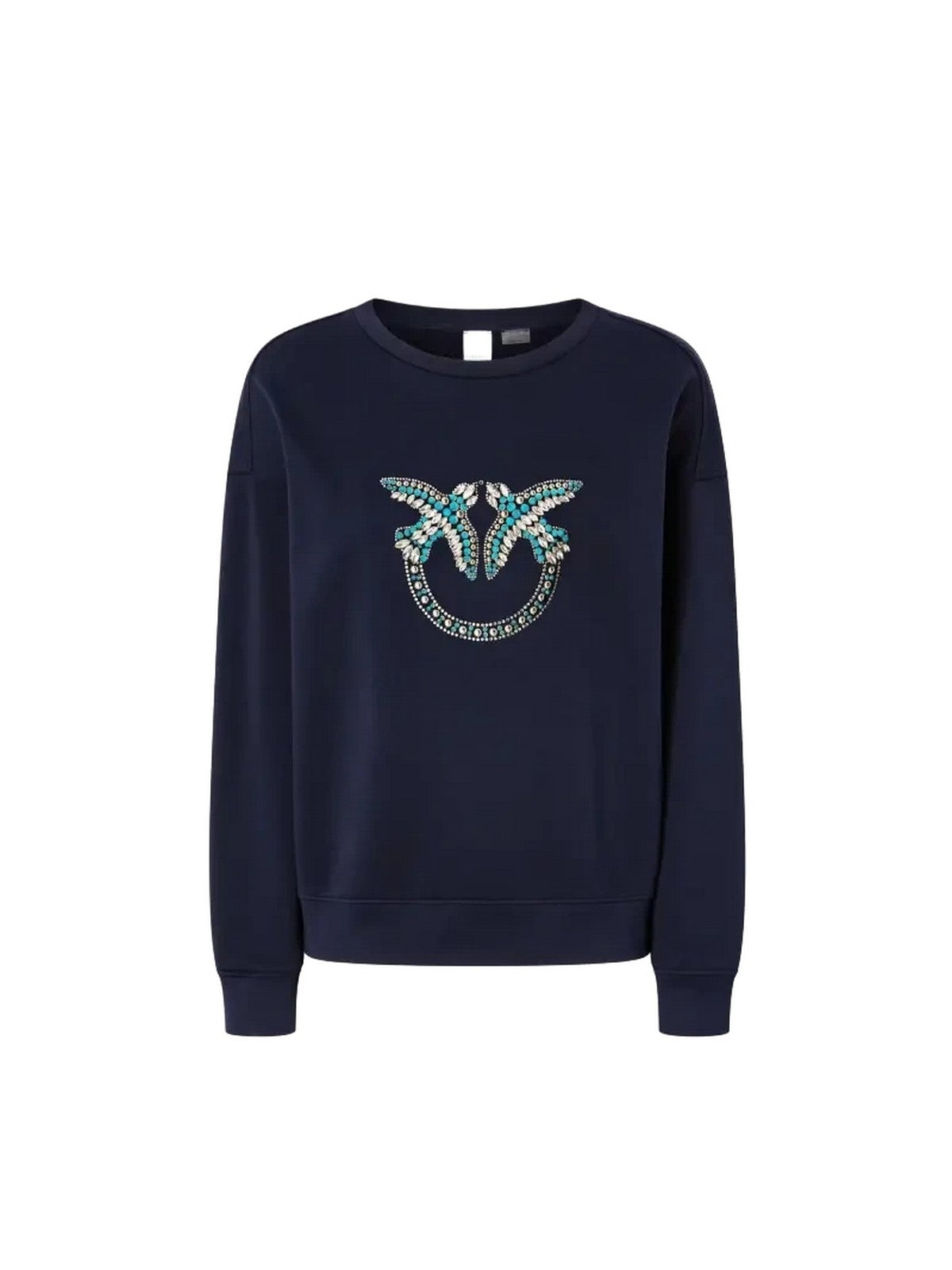 Felpe senza cappuccio Donna Pinko - Felpa girocollo con ricamo gioiello Love Birds - Blu