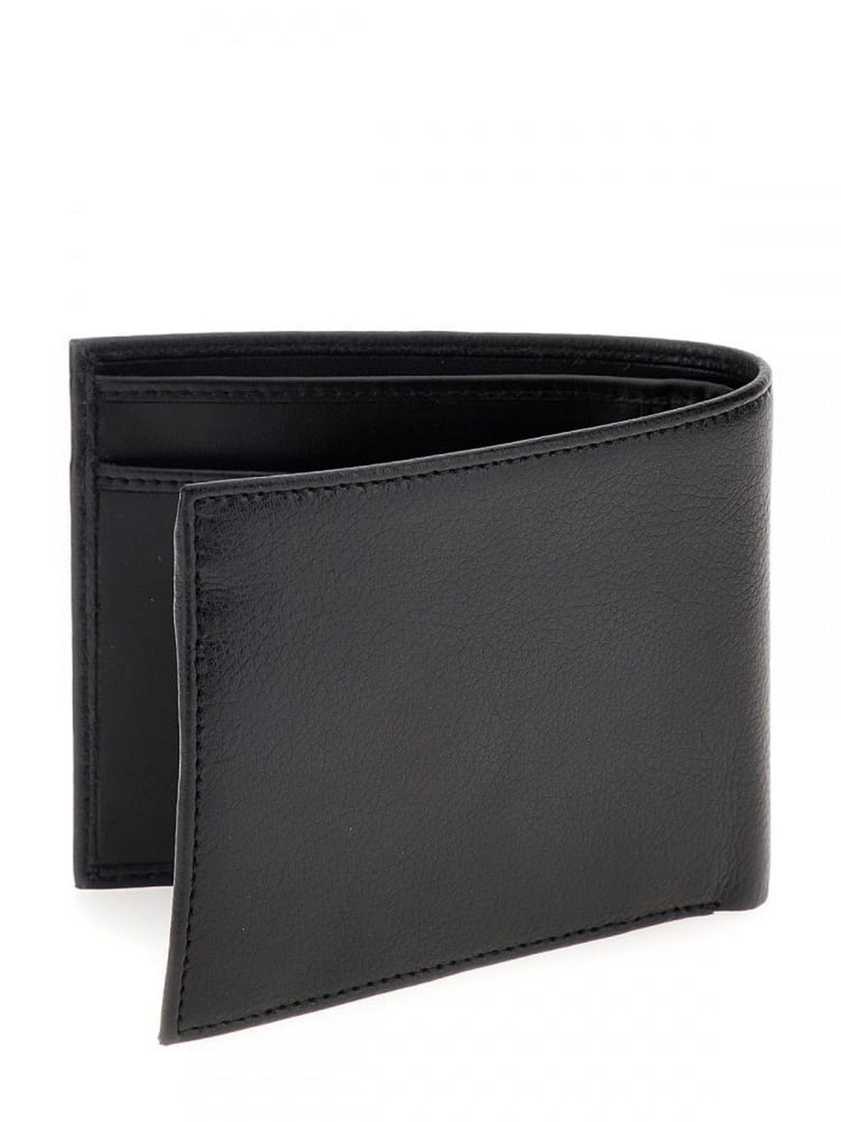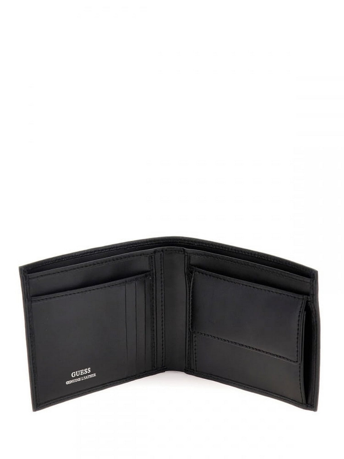 Portafoglio uomo GUESS in pelle. Scritta logo a contrasto. All'interno scomparto per carte business, documenti e banconote. Scomparto per monete con chiusura.