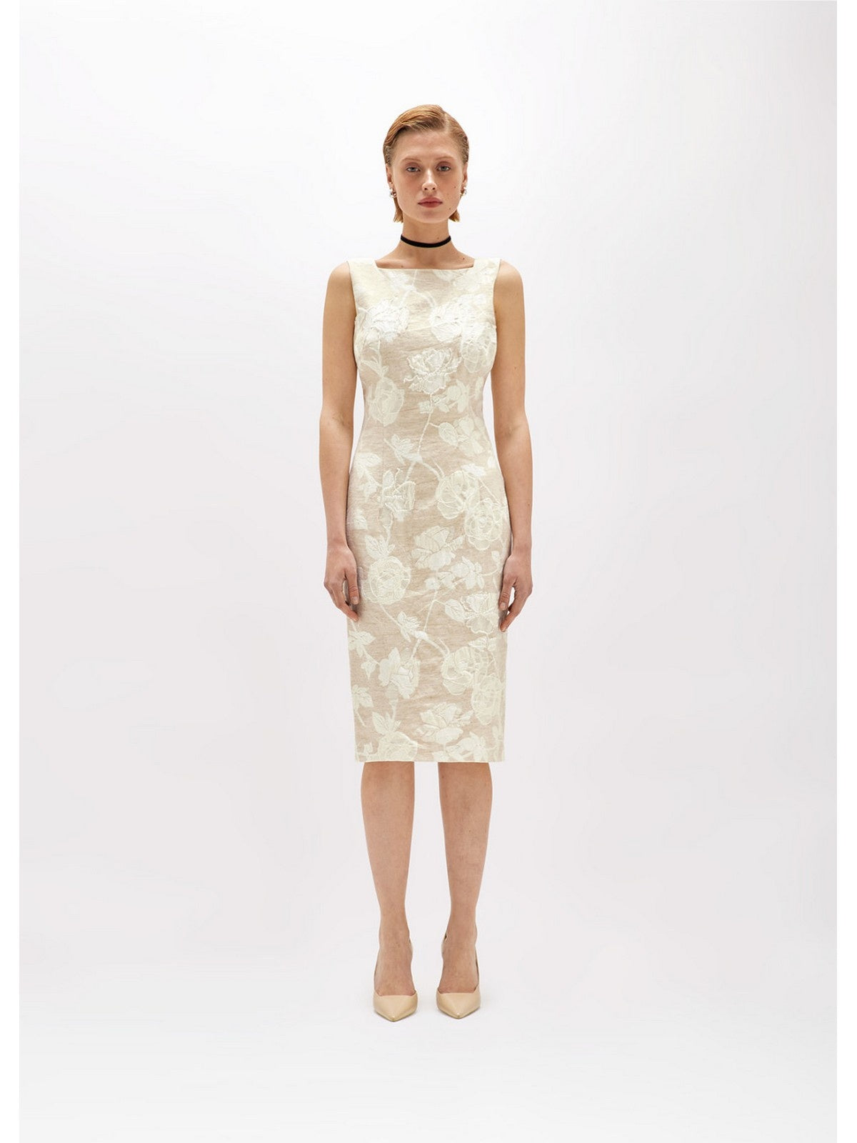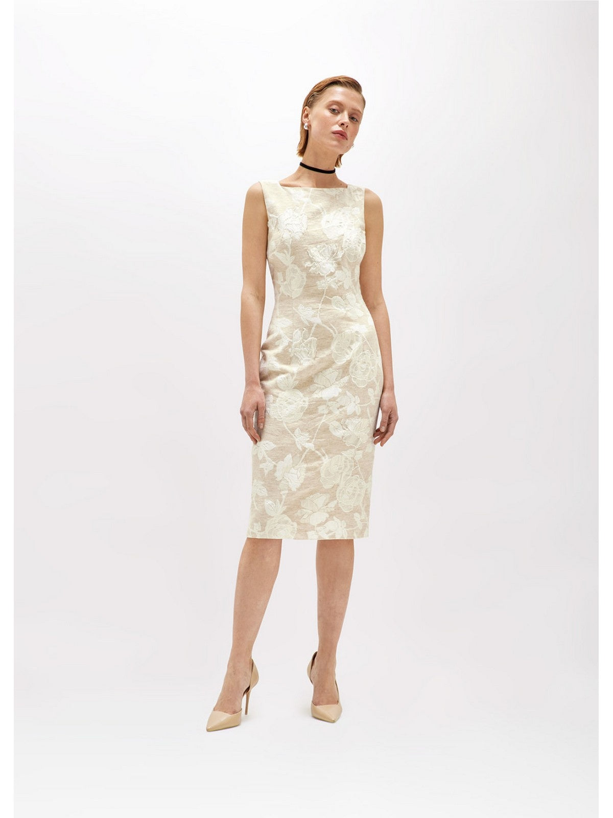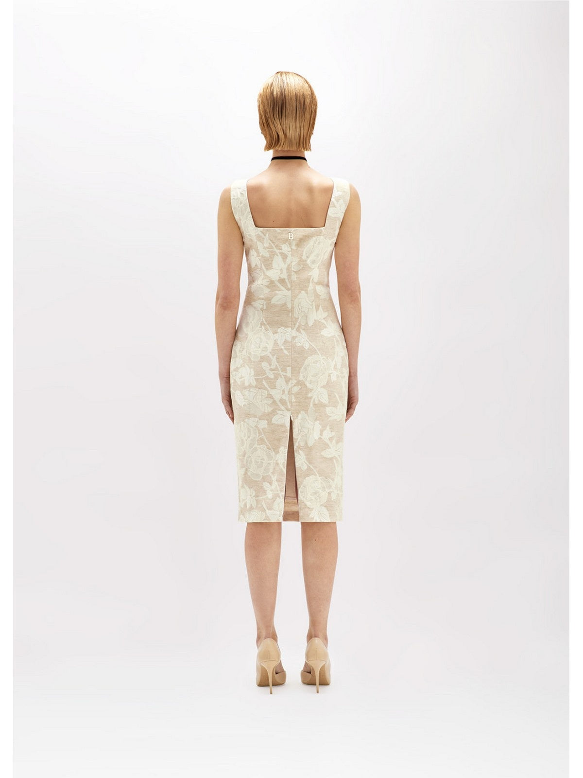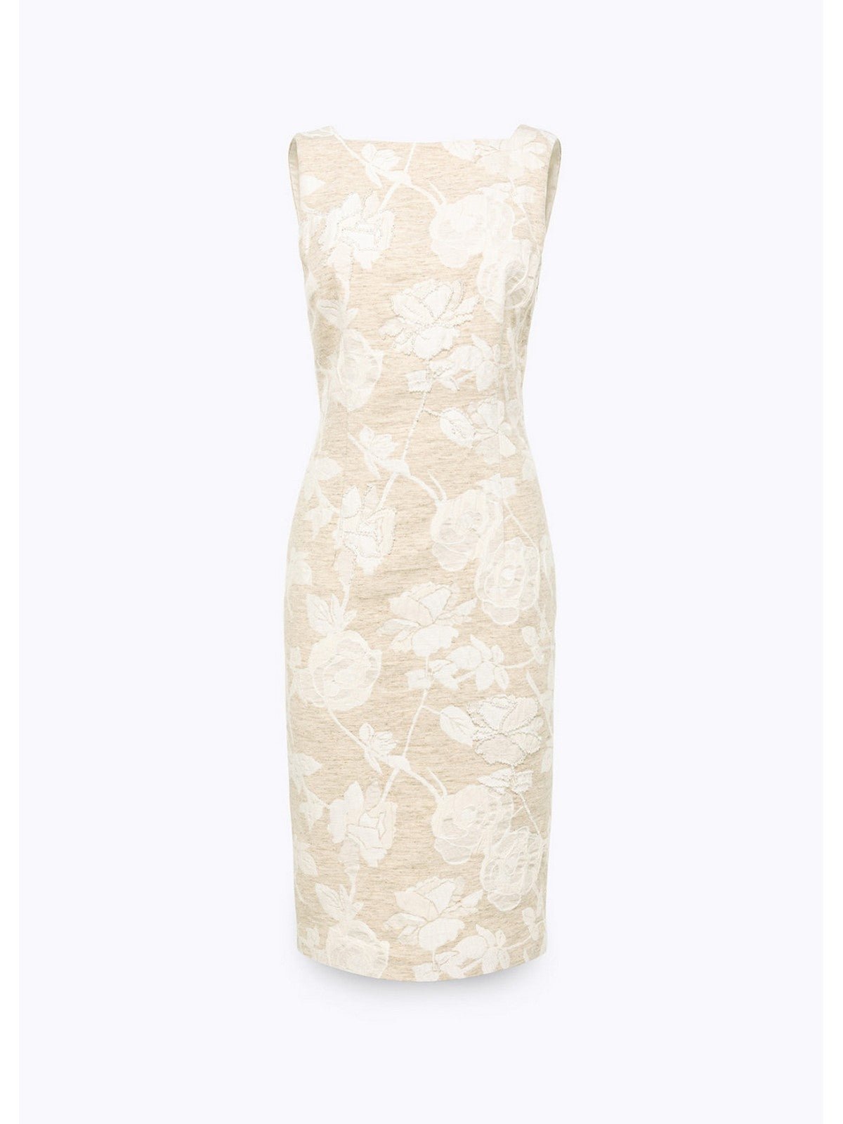 L'ABITO A TUBINO SI RINNOVA CON QUESTO ABITO IN TESSUTO JACQUARD A MOTIVO FLOREALE CON RICAMO LEGGERO TONO SU TONO. HA COLLO SQUADRATO DAVANTI E DIETRO, CHIUSURA CON ZIP AL FIANCO, SPACCO AL FONDO SUL RETRO REGOLABILE CON ZIP. L'OPZIONE IDEALE PER EVENTI E CERIMONIE, DA ABBINARE ALLA GIACCA BOXY IN COORDINATO.COMPOSIZIONE: 63% COTONE 27% VISCOSA 10% LINO