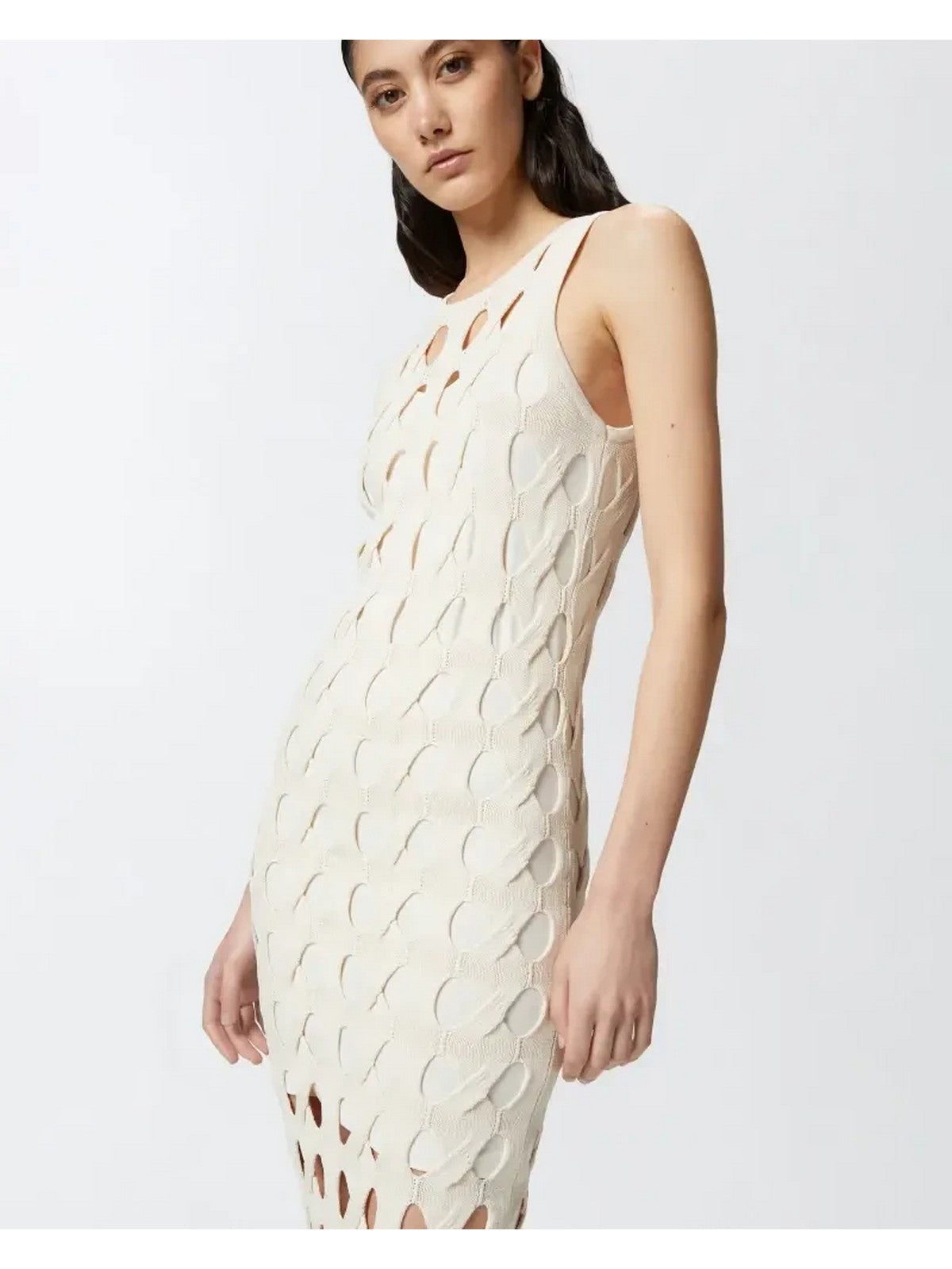 Vestito senza maniche dalla lunghezza midi realizzato in maglia di misto viscosa caratterizzata da una particolare lavorazione a trecce e trafori. La superficie traforata crea un effetto trasparente, attenuato dalla sottoveste abbinata, corta a metà coscia. La linea aderente dell'abito da donna, insieme alla sua particolare lavorazione traforata, rendono questo capo un look perfetto per le occasioni speciali che lasciano spazio alla creatività e alla femminilità.