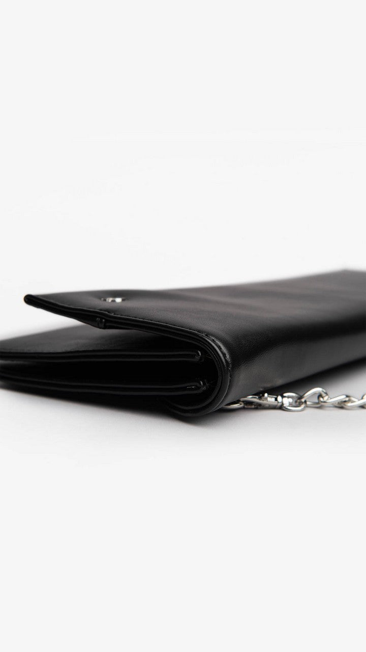 Pochette realizzata in materiale tecnico con stampa vitello. Due comodi scomparti interni con tasca di servizio. Chiusura con bottone automatico. Dotata di una pratica tracolla in catena in abbinamento.