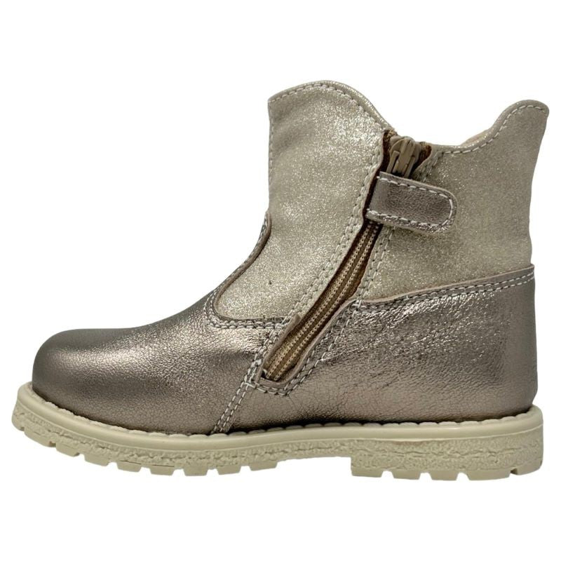 Realizzati in vera pelle effetto metallizzato, questi stivaletti combinano qualità artigianale e stile italiano. Il colore bronzo dorato, brillante e versatile, si abbina facilmente ad ogni outfit, rendendoli ideali sia per le occasioni speciali che per l'uso quotidiano.