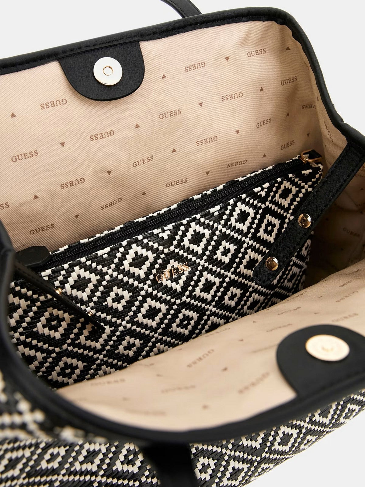 Borsa GUESS realizzata in rafia con Inserti in simil pelle. Lavorazione geometrica. Triangolo logo in metallo frontale. Chiusura con bottone.