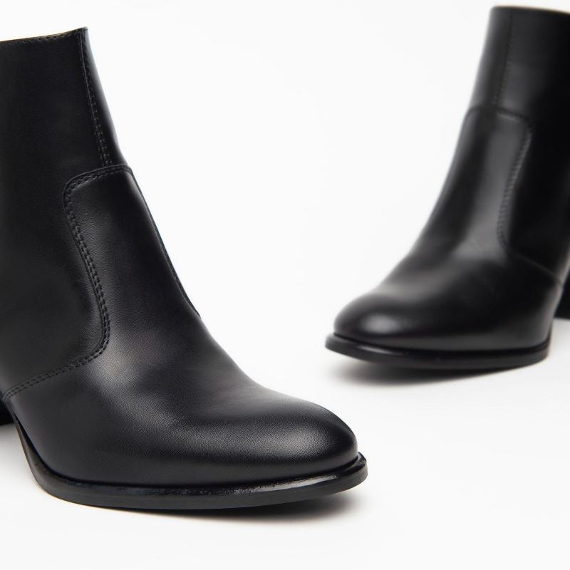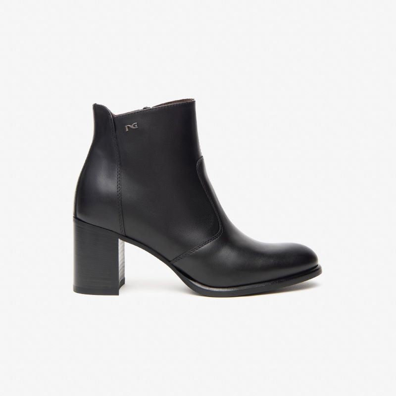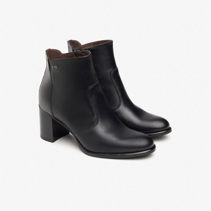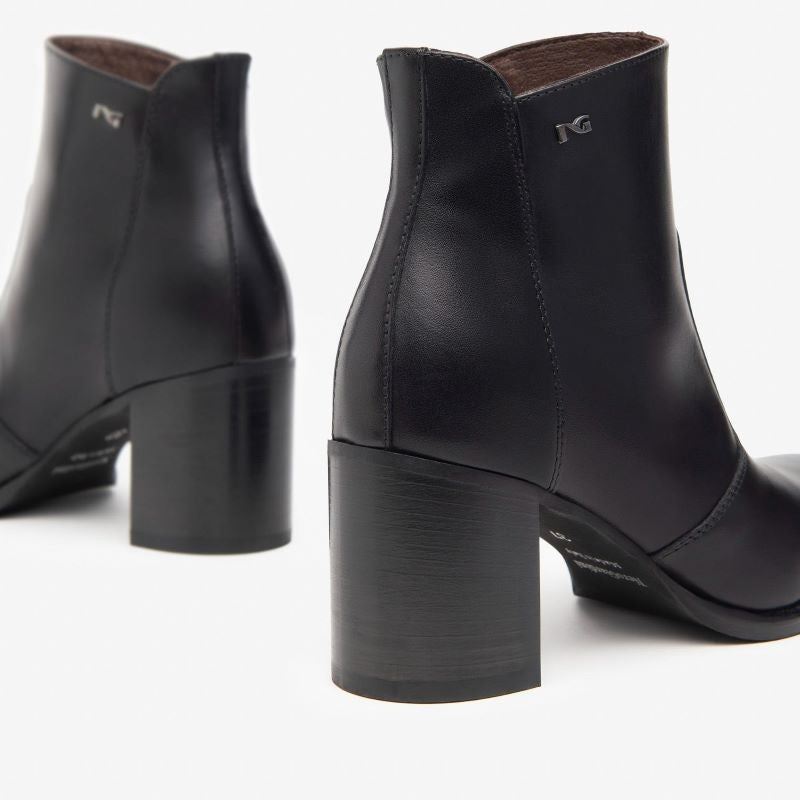 Realizzati in pregiata pelle liscia nera, questi stivaletti presentano una linea pulita e sofisticata, arricchita solo dal discreto logo metallico "NG" sul lato esterno. Il design minimal li rende ideali sia per outfit formali che casual chic, da abbinare facilmente a pantaloni, gonne o abiti.