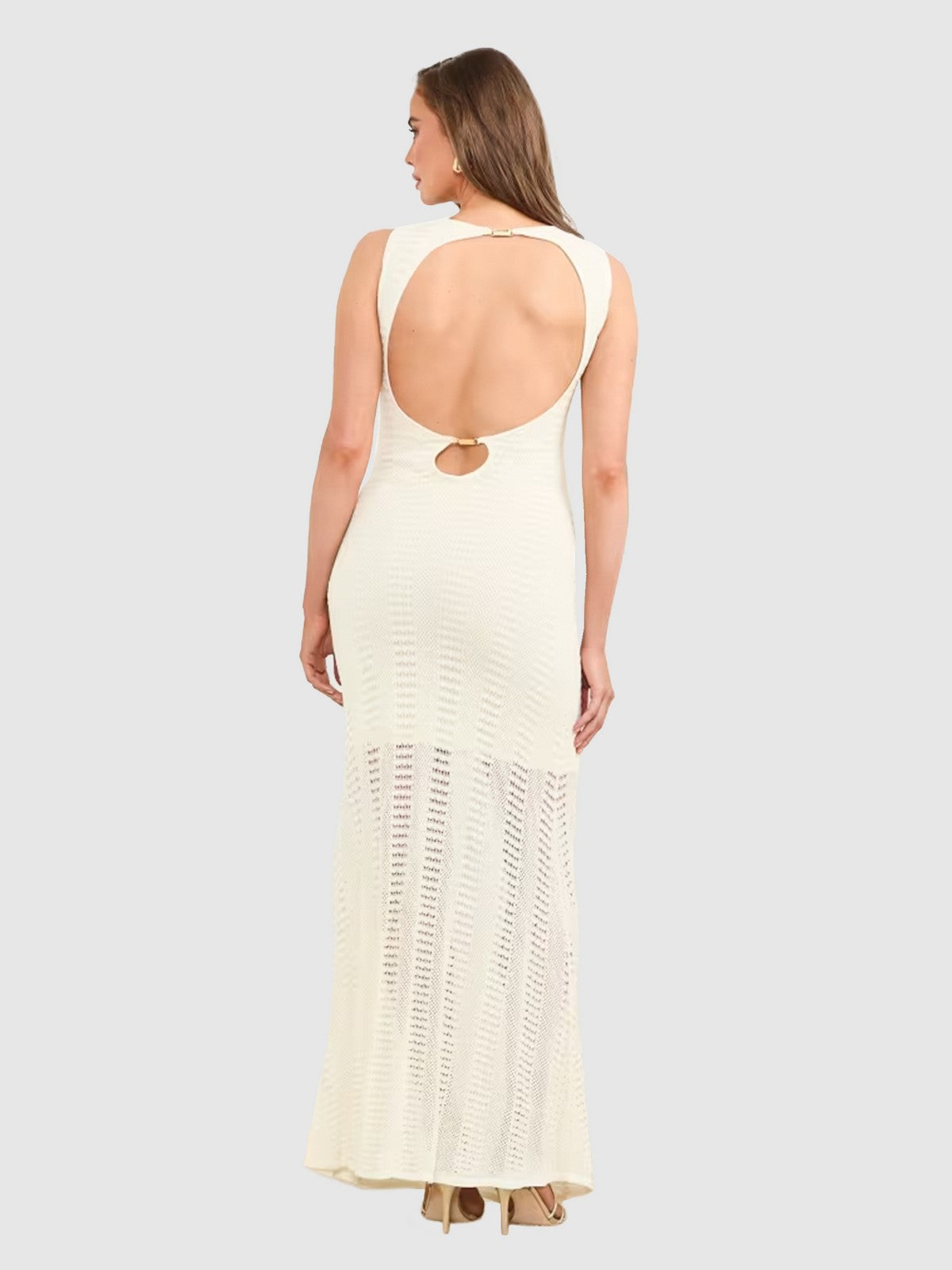 Completa il look con un paio di décolleté dorate e una pochette coordinata. L'insieme è perfetto per un evento elegante, combinando raffinatezza e classe in un abito senza tempo.