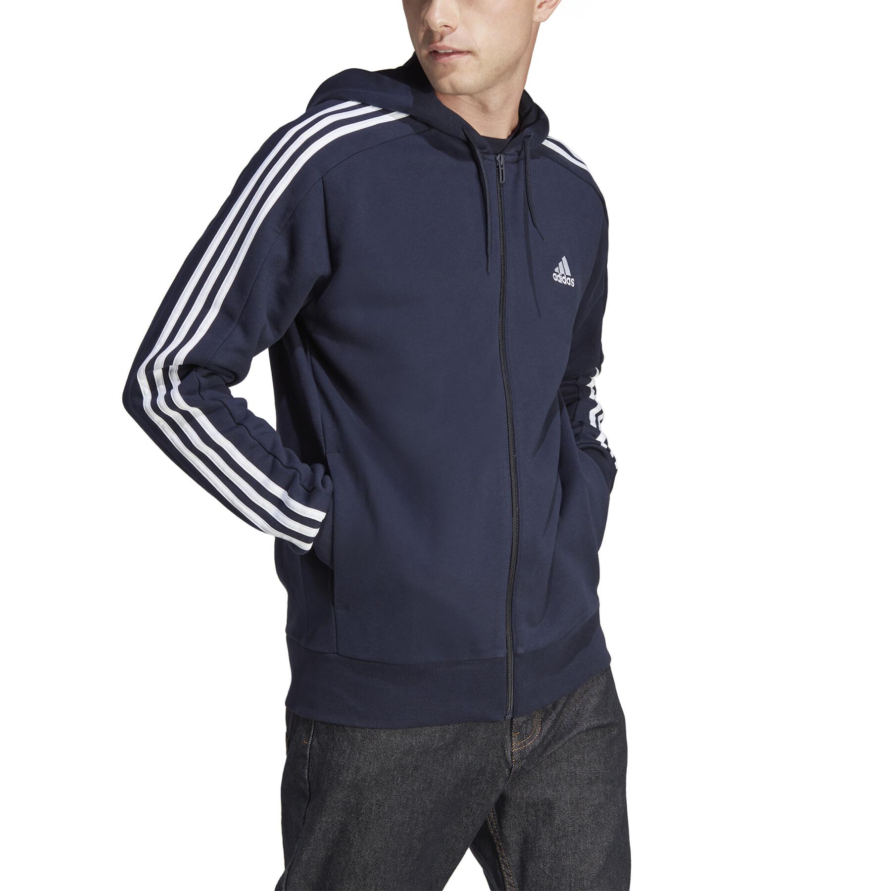Felpa Adidas con cappuccio full zip essentials in french terry (cotone garzato) con tre strisce.  Felpa Adidas uomo con zip versatile e sportiva adatta ad ogni situazione. Vesibilità regolare, zip integrale e cappuccio regolabile con cordino, 100% cotone, tasche anteriori, polsini e orlo a costine.  Salbini articoli tecnici per lo sport è rivenditore Adidas .