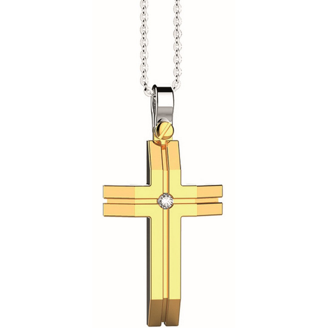 Realizzata in lussuoso oro bianco 18kt, questa squisita collana presenta un pendente a croce in oro giallo 18kt, ornato da un diamante centrale del peso di 0,035 carati.