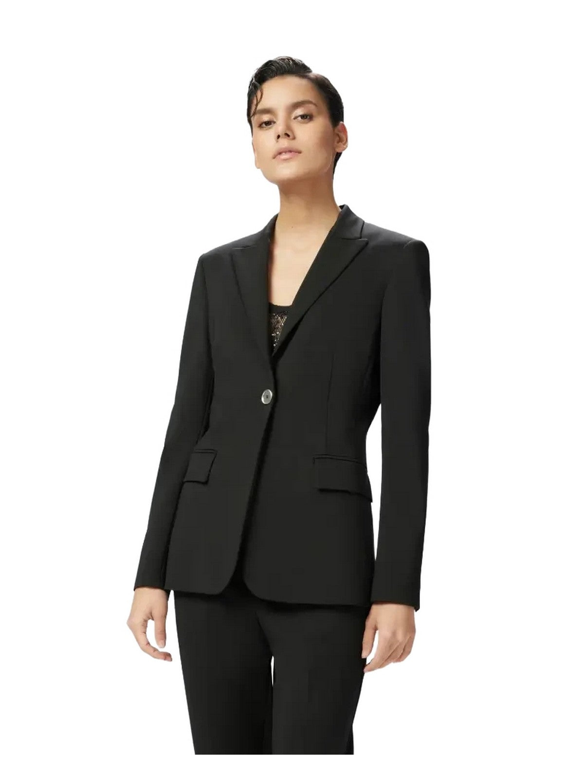Giacca blazer monopetto dalla linea sfiancata in tessuto tecnico di viscosa stretch lavorata a punto stoffa con un particolare effetto scuba. Questo capo è realizzato con il 52% di viscosa da foreste gestite responsabilmente. Il blazer è completato da collo a rever, maniche lunghe con bottoni in metallo al fondo e tasche a filetto con patta applicata sui fianchi. Il blazer è foderato in tessuto e la chiusura monopetto è completata con bottone singolo in metallo. per un tocco scintillante e originale. Questa giacca è l'alleato perfetto di qualsiasi look che necessiti un tocco elegante: indossala in un completo, con un paio di pantaloni spezzati oppure sopra un abito per una cerimonia.Tessuto Esterno: VISCOSA 73% LINO 27% - Fodera: ACETATO 65% VISCOSA 35%