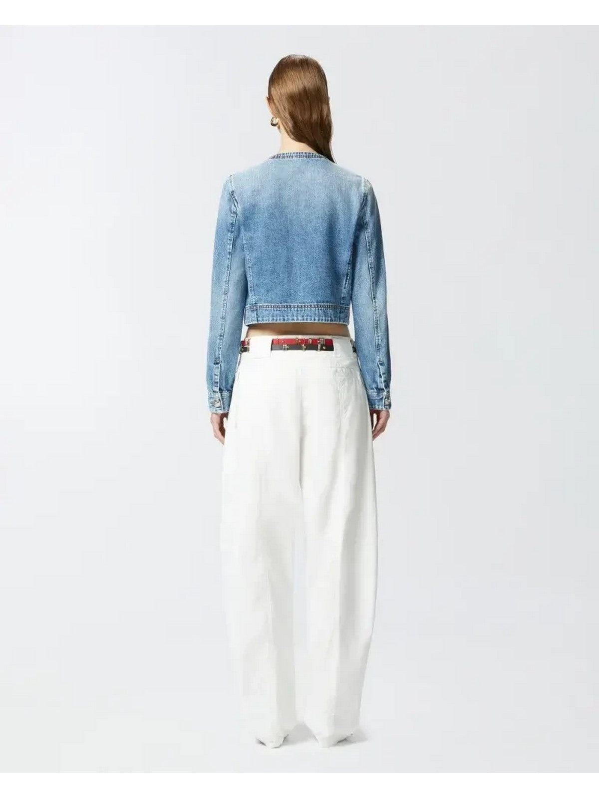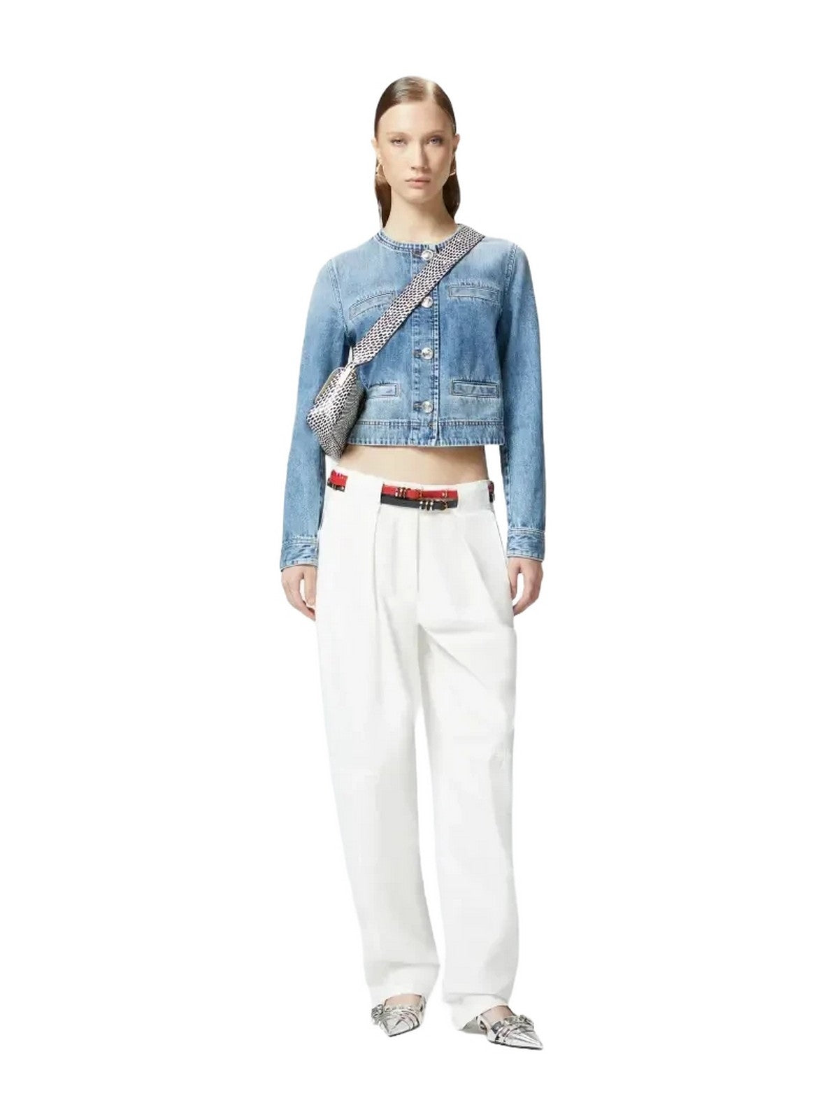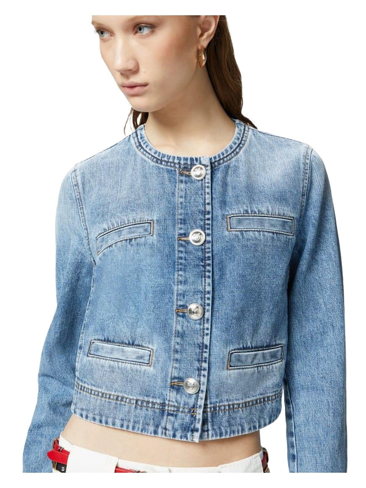 Piccola giacca da donna in denim di cotone caratterizzato da un lavaggio medio blue riot. La linea aderente ed elegante di questa giacca è definita da due coppie di taschini a filetto e da chiusura monopetto con bottoni in metallo logati con uccellini Love Birds. Questo capo è un update contemporaneo e bon-ton del classico giubbino in denim, un vero indispensabile del guardaroba quotidiano primaverile.