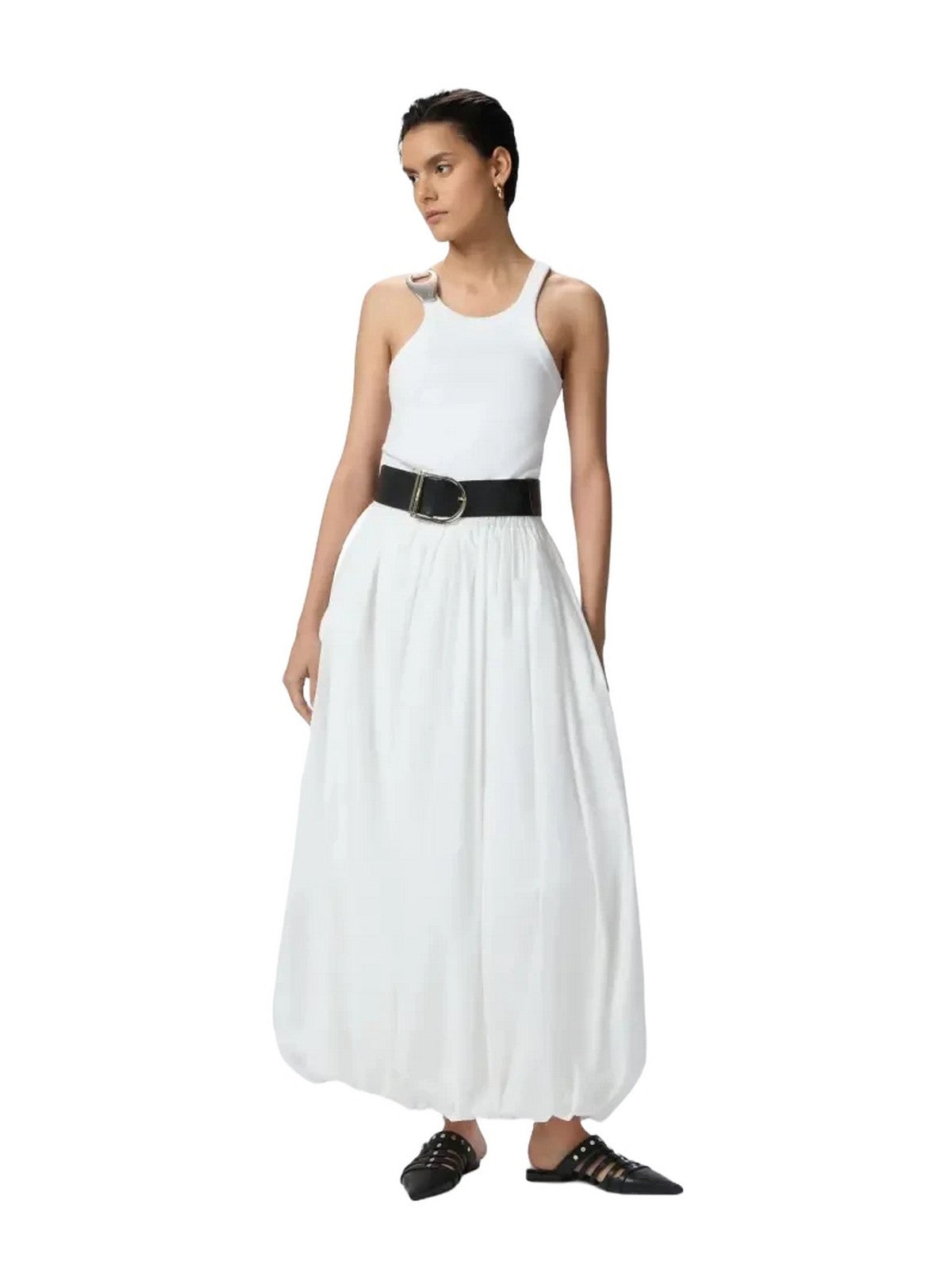 Maxi gonna dalla silhouette balloon realizzata in leggero popeline di cotone caratterizzata da una forma a palloncino, voluminosa e arrotondata al fondo. La gonna lunga è completata da tasche inserite sui fianchi ed elastico in vita, per una vestibilità comoda abbinata a uno stile femminile. Indossa la gonna con un top a canotta e la tua cintura preferita per un outfit estivo fresco e ricercato.