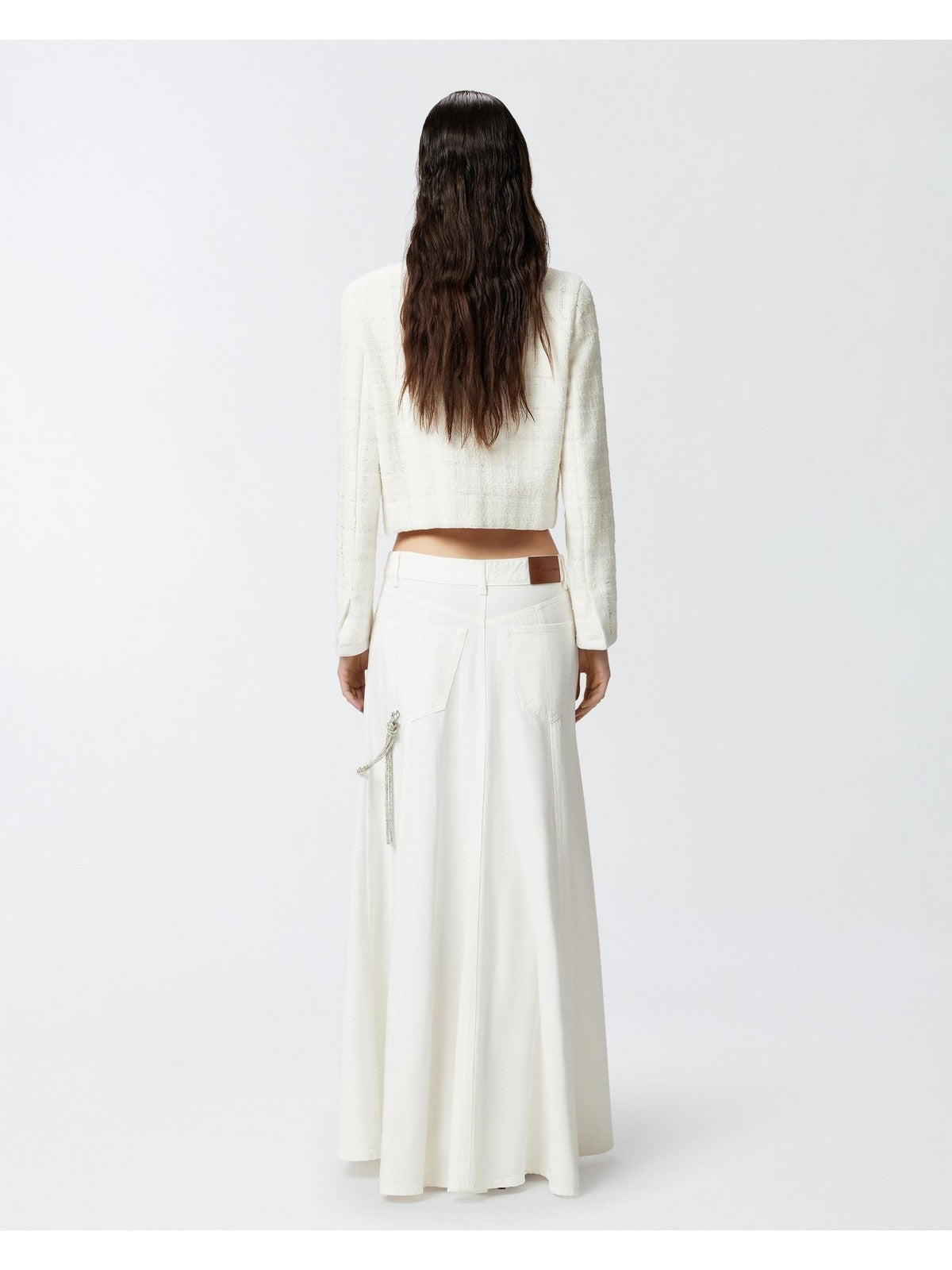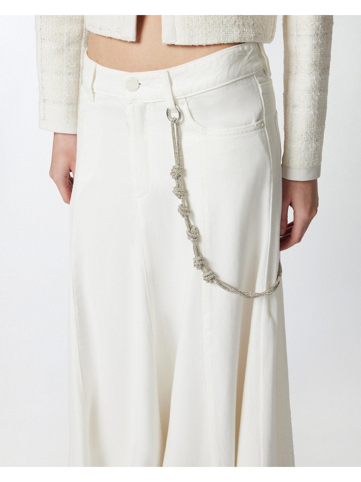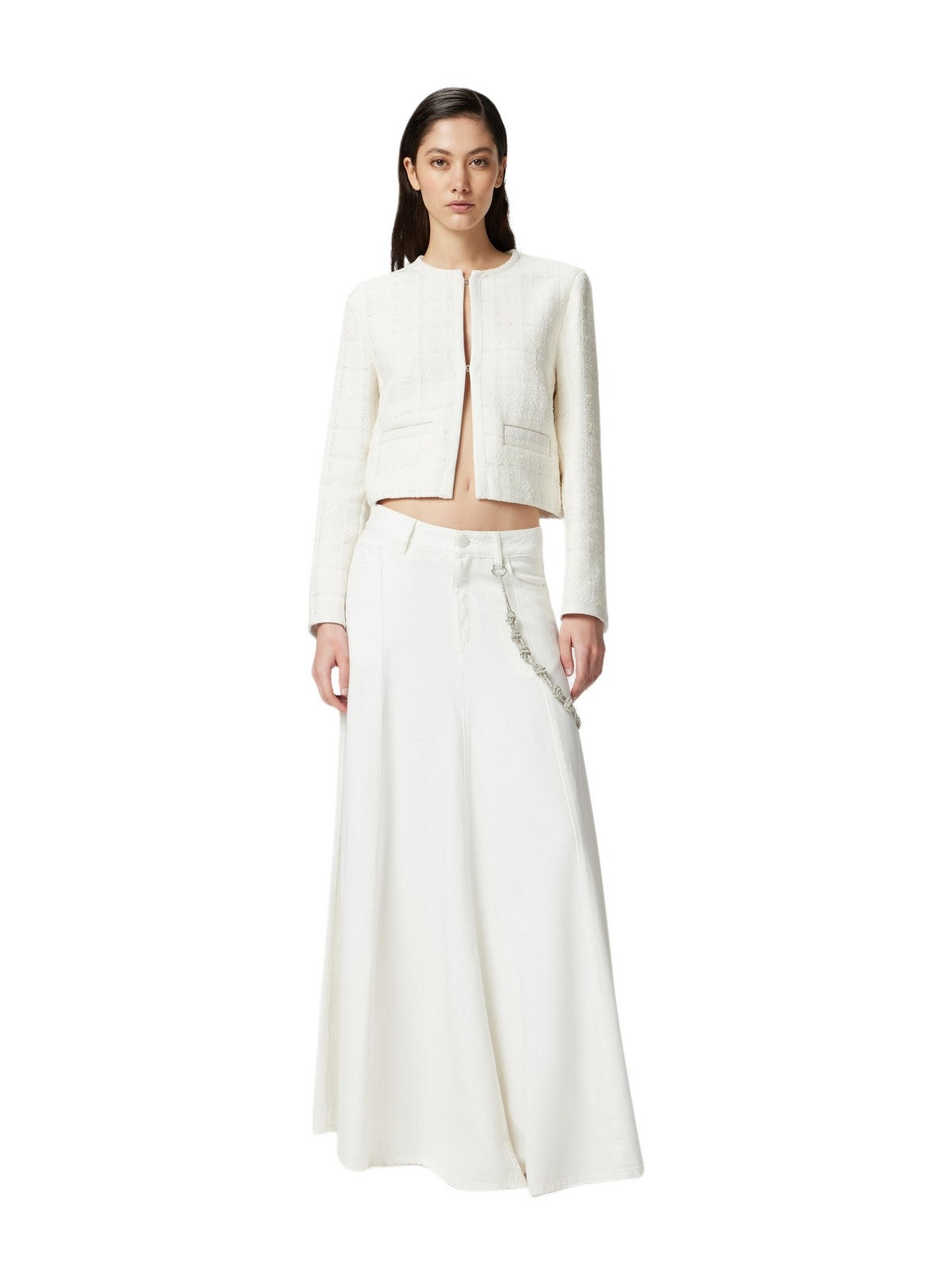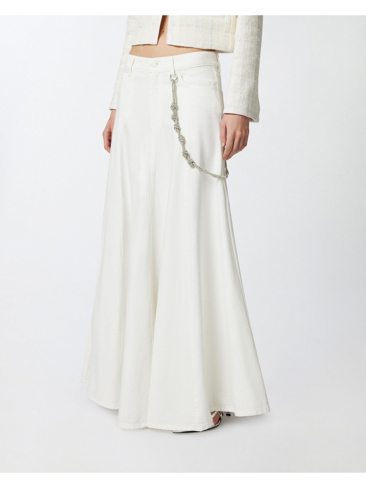 Gonna lunga e ampia realizzata in bull di misto cotone e lyocell slegato, dalla particolare texture morbida e leggera. La linea cinque tasche della gonna e la chiusura con zip e bottone a chiodo in metallo richiamano il mondo del denim, e la catena gioiello, impreziosita con strass luminosi e agganciata con piccoli moschettoni ai passanti in vita aggiunge un tocco speciale. La linea ampia di questa gonna e i suoi dettagli ricercati sono perfetti per creare outfit quotidiani da indossare per rendere speciale anche una semplice giornata in ufficio.