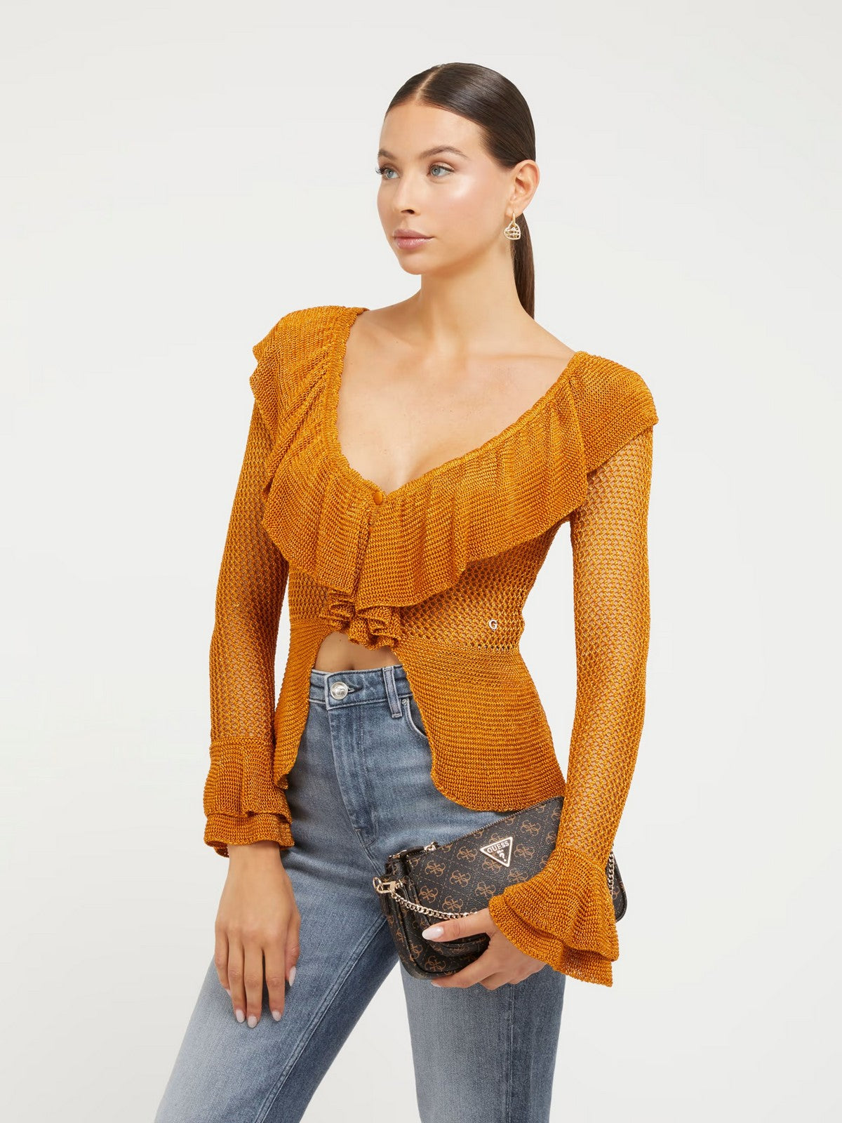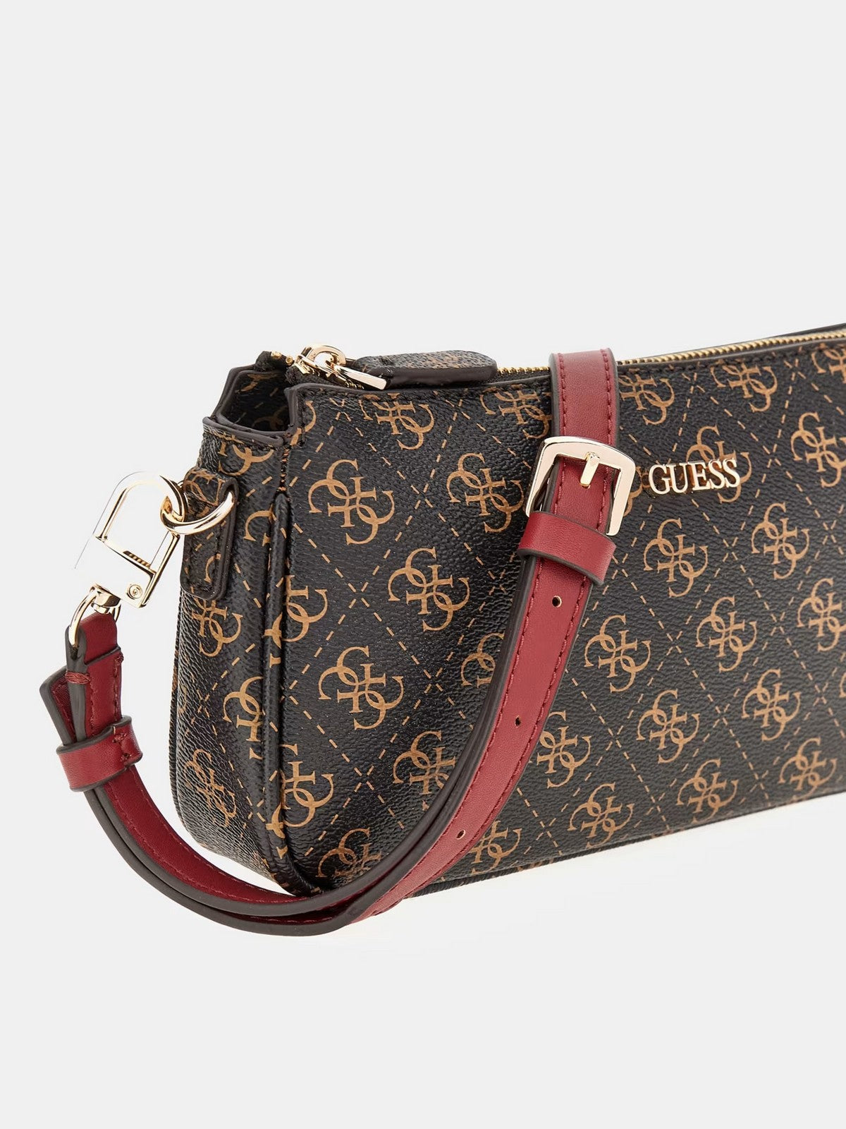Borsa tracolla GUESS in simil pelle. Stampa 4G logo. Triangolo logo in metallo frontale.