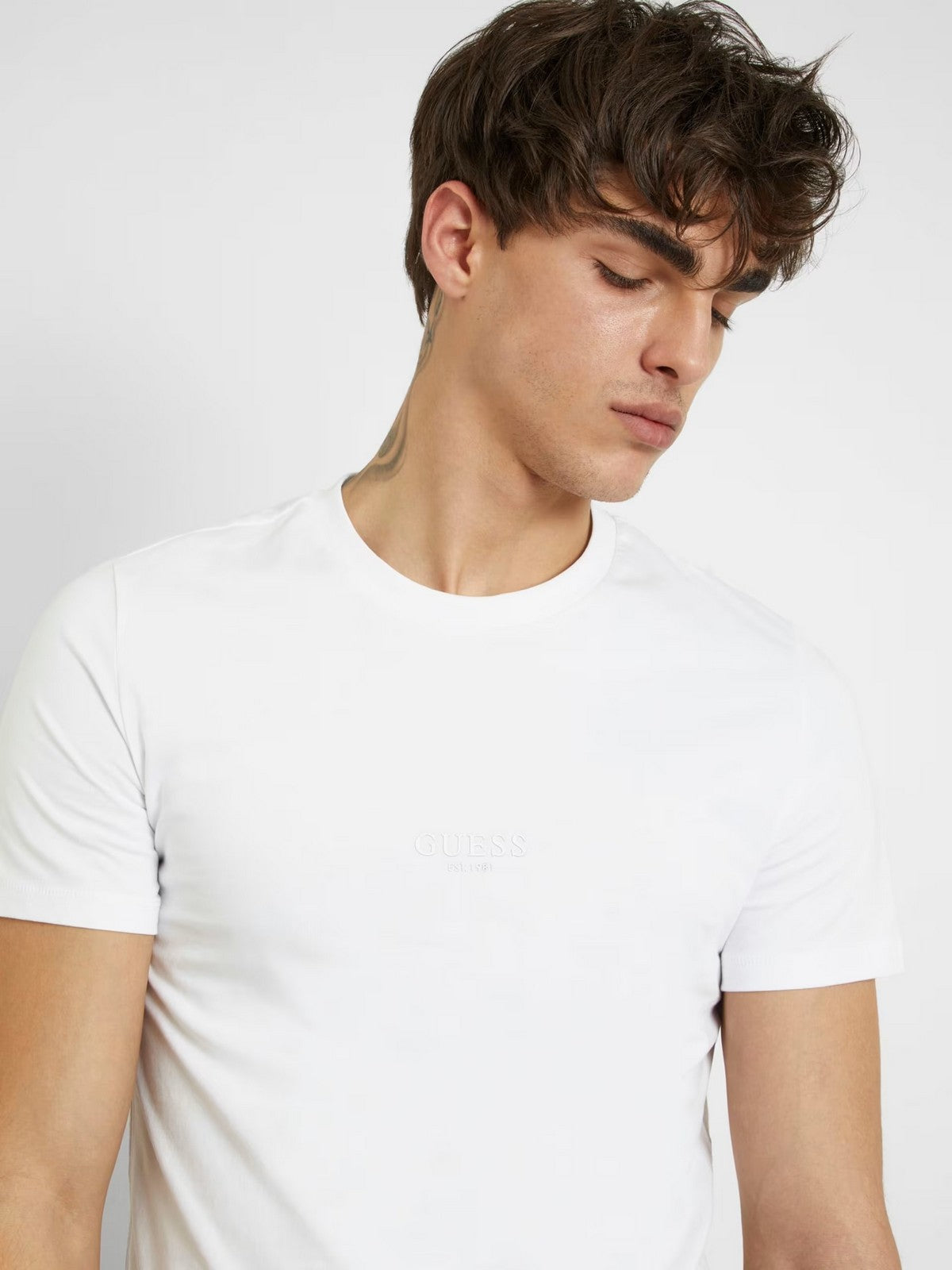 T-shirt GUESS da uomo, realizzata in cotone. Scritta Logo frontale, tono su tono. Collo a giro e maniche corte. Orlo dritto