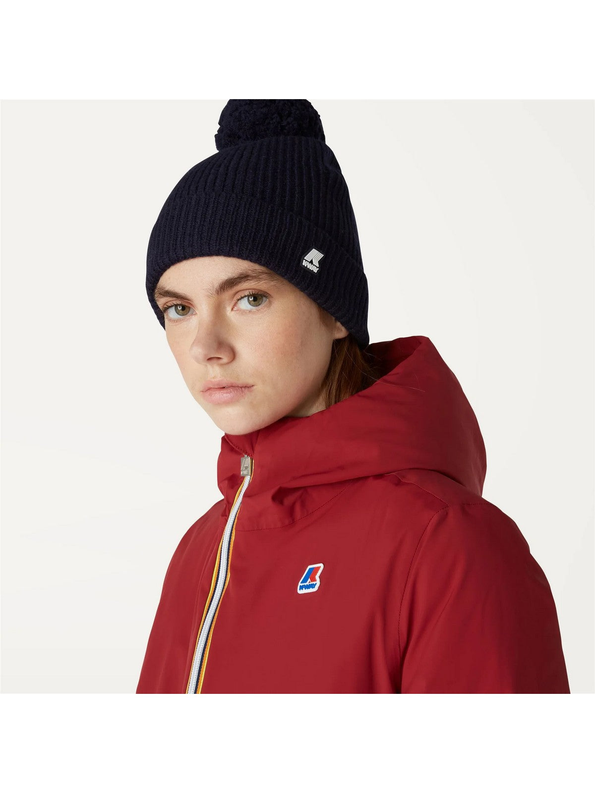 Cappello K.WAY realizzato in misto lana lavorato a costa inglese con pon pon tono su tono e risvolto sulla fronte per una doppia dose di protezione.