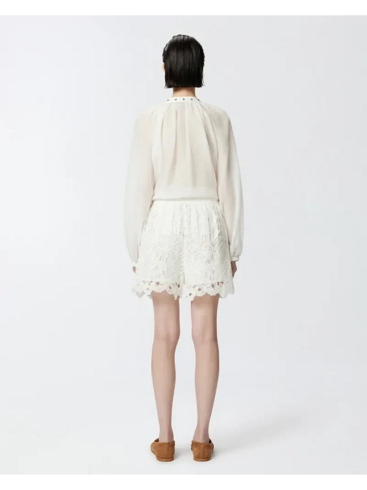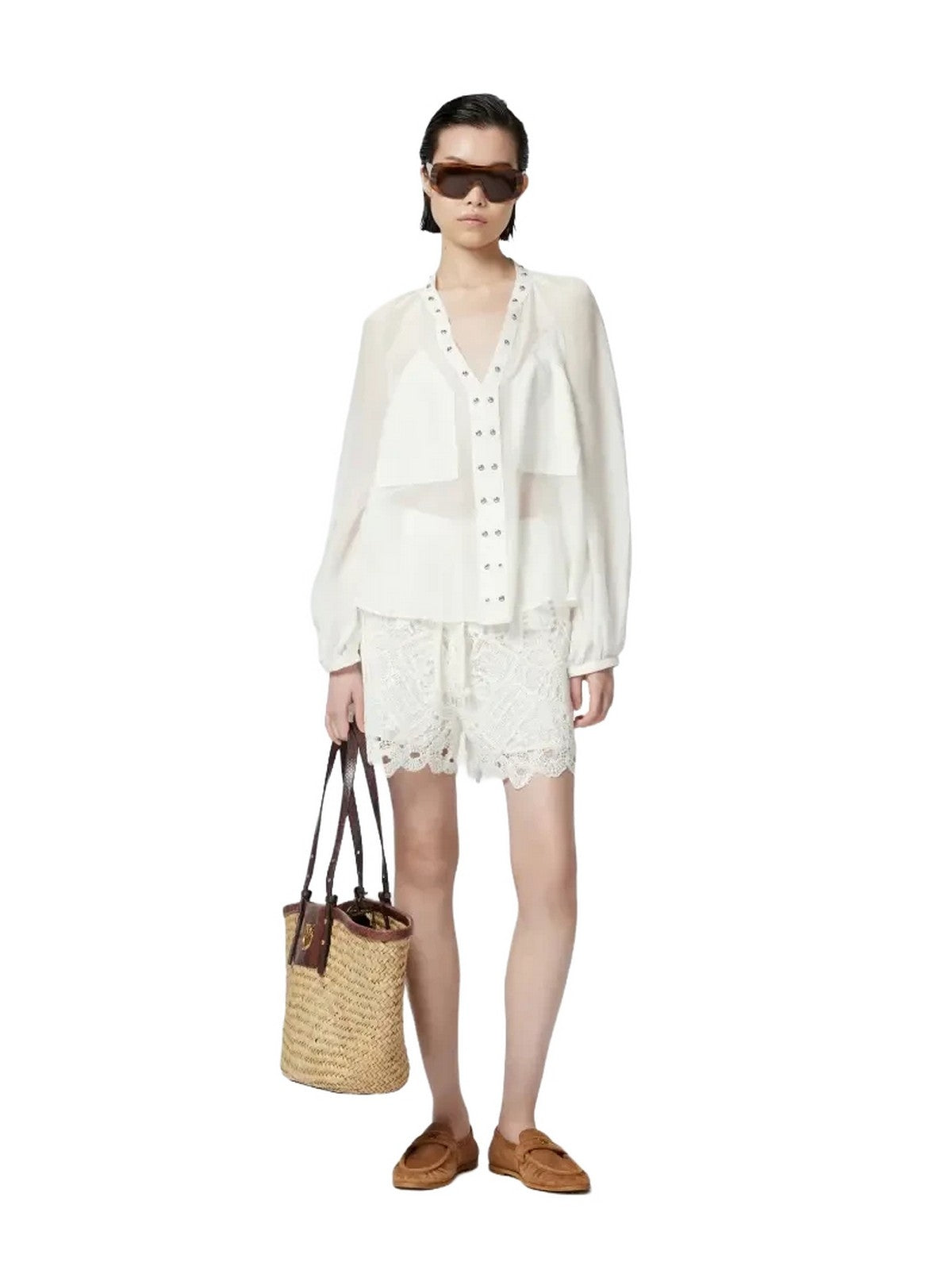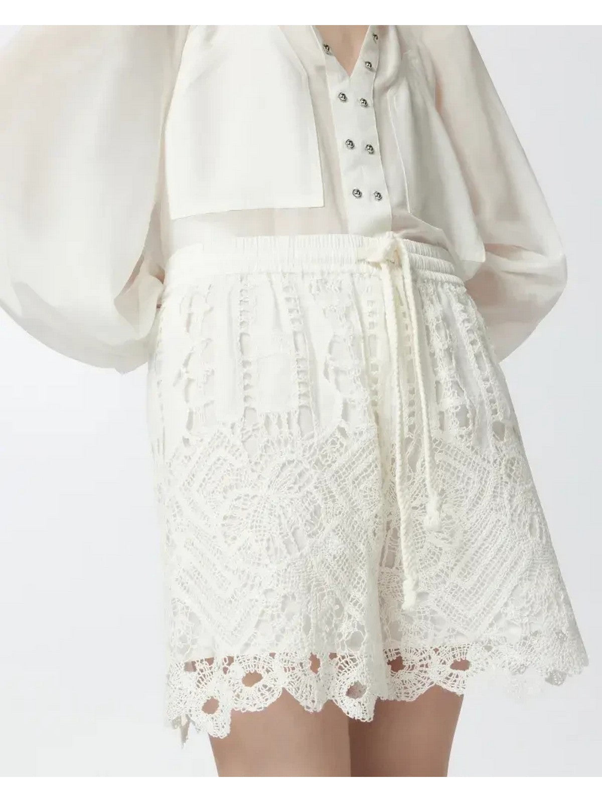 Pantaloncini corti da giorno in raffinato pizzo sangallo con dettagli in macramè, che insieme creano un particolare disegno traforato che continua su tutta la lunghezza della gamba fino a creare un orlo smerlato a fondo capo. Gli shorts, estivi e femminili, sono completati da fodera interna in cotone che attenua la trasparenza della trama traforata creata dal tessuto e dona una sensazione fresca a contatto con la pelle. La vita alta con cavallo rilassato, elastico e laccetto da annodare garantisce una vestibilità perfetta. La lavorazione ricercata e la leggerezza del tessuto rendono questi pantaloncini il capo perfetto per affrontare anche la più calda delle giornate in città.