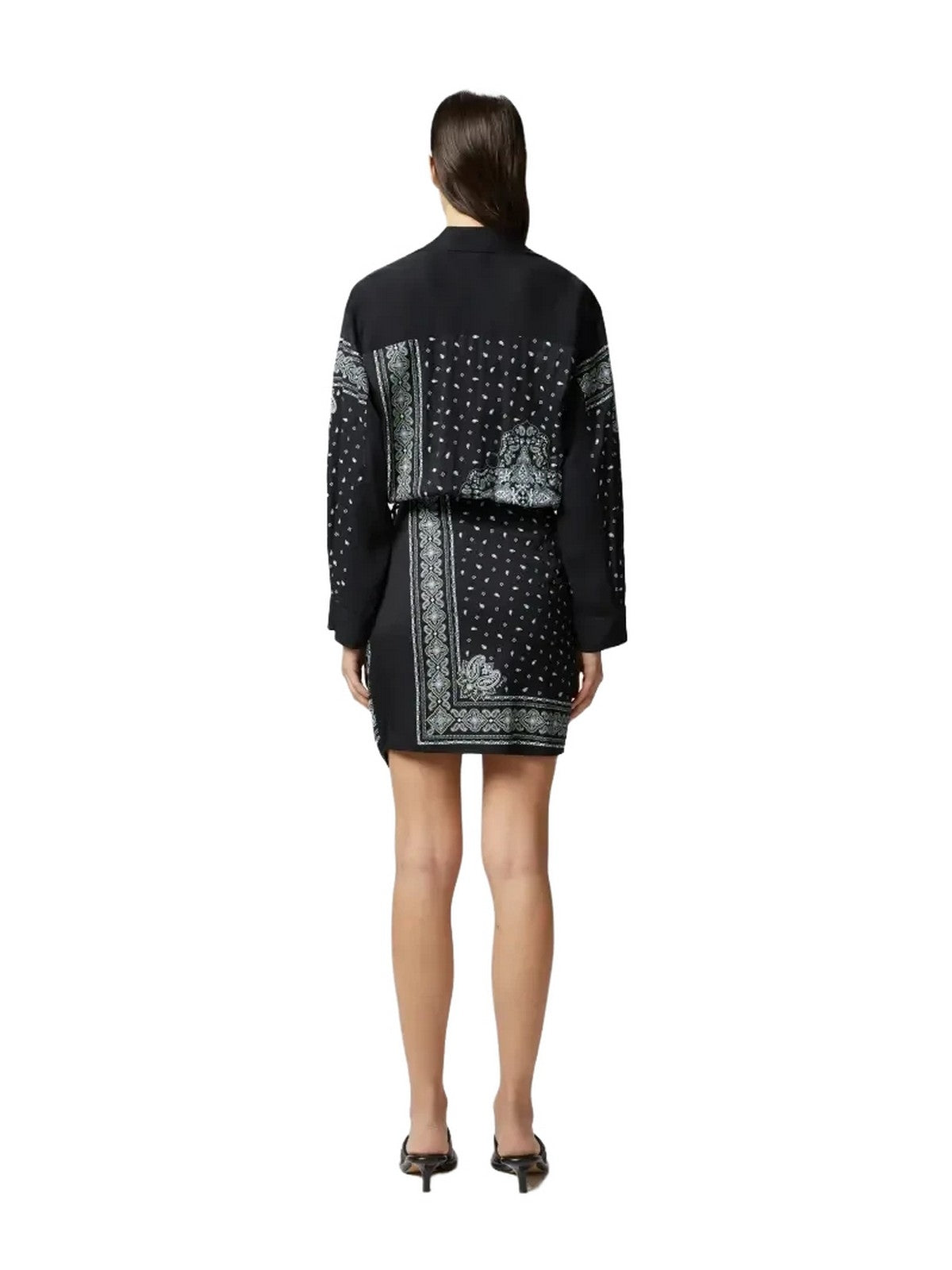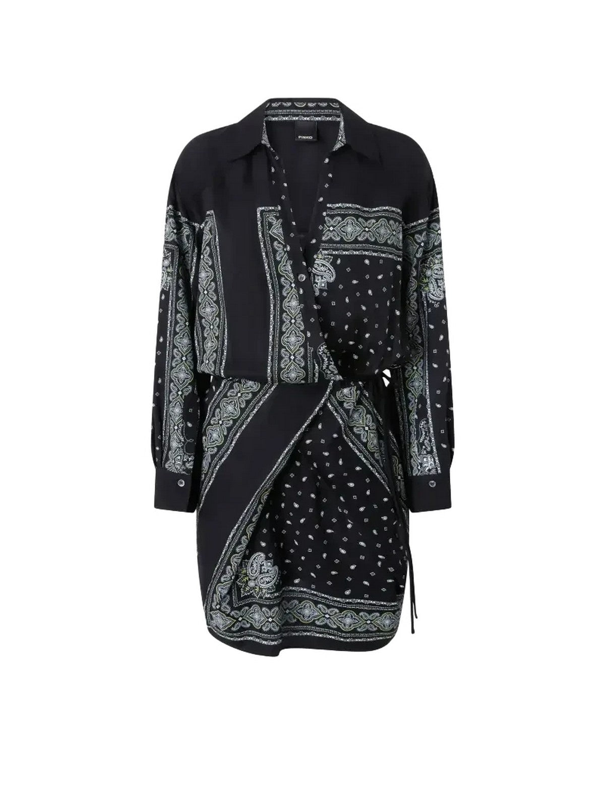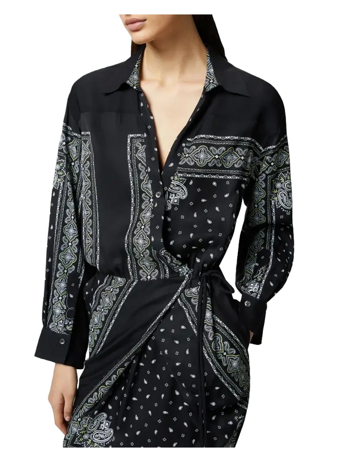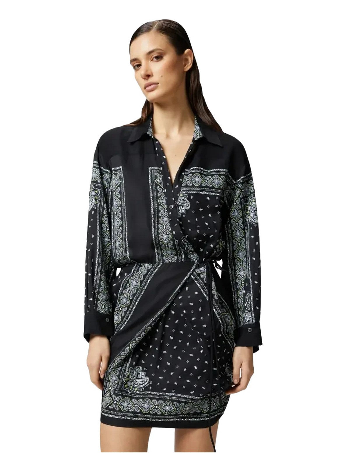 Vestitino corto dalla linea a camicia realizzato in tessuto twill di viscosa con stampa paisley a bandana e inserti in leggera georgette di viscosa. Il mini abito chemisier simula l'effetto di un abito a portafoglio, dove la camicia è incrociata nella parte superiore e anche la gonna corta con tasche sui fianchi si incrocia davanti, chiudendo con un laccetto laterale. Il classico colletto a camicia è completato da scollo a V per un ulteriore dettaglio femminile per un abito estivo che ti farà sentire in vacanza anche quando stai andando a lavorare.