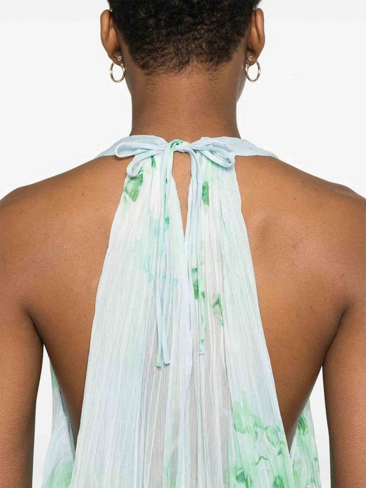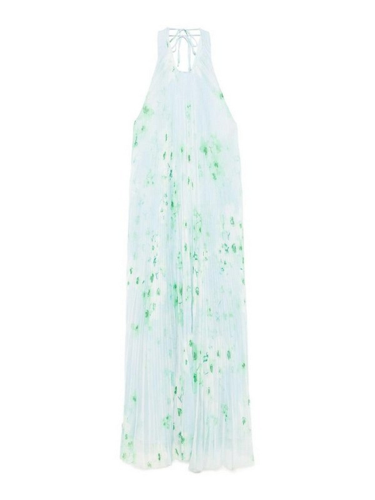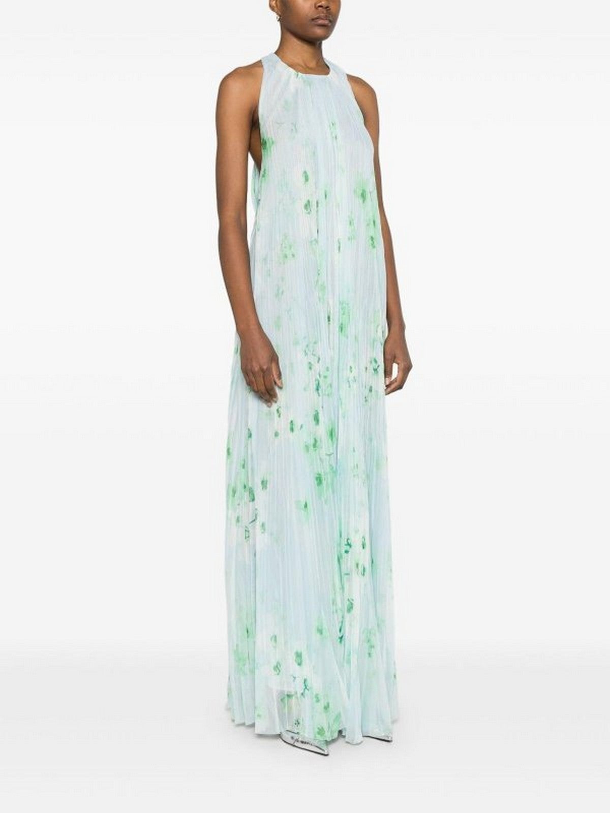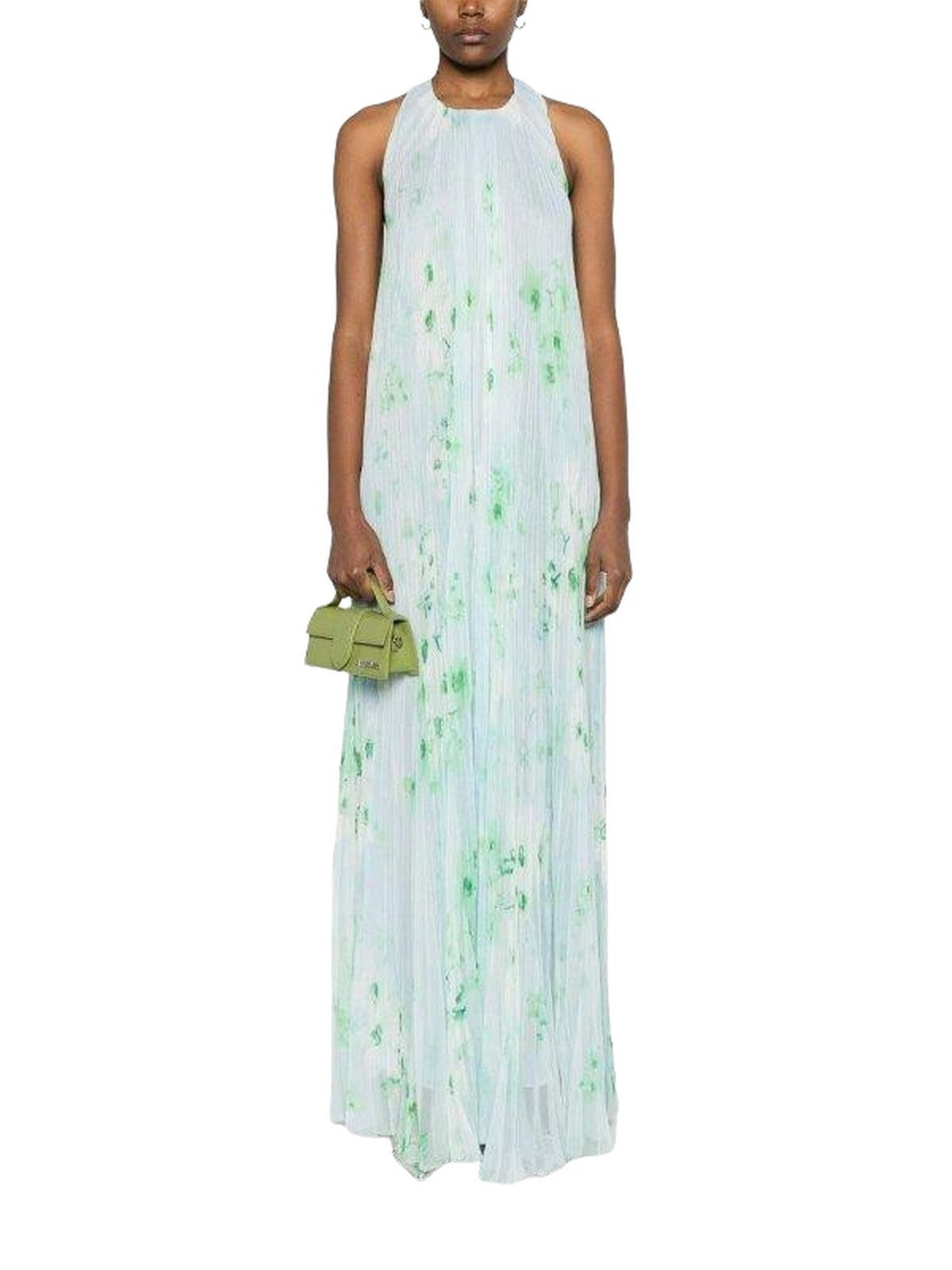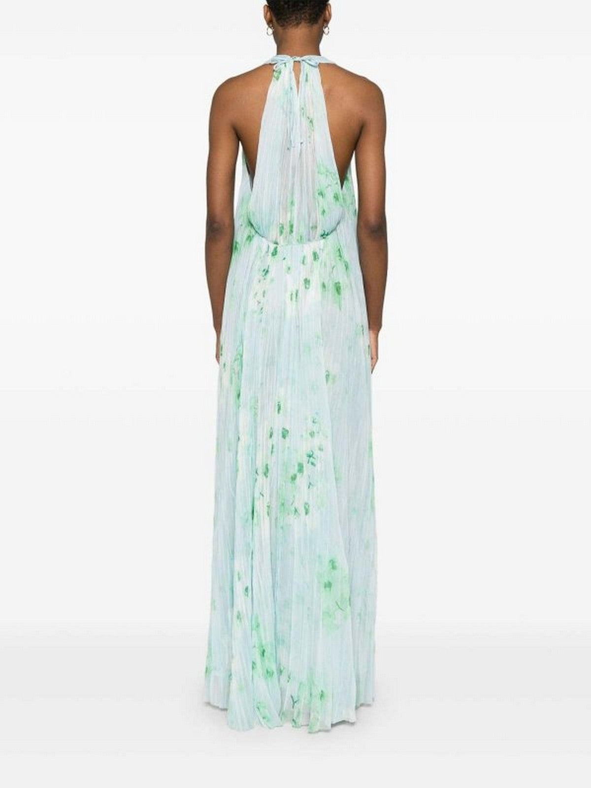 Abito lungo elegante realizzato in leggero tessuto creponne plissè personalizzato da una delicata fantasia floreale. Le linea senza maniche di questo vestito da cerimonia è completata da scollo all'americana allacciato con due piccoli bottoni sul retro e schiena parzialmente scoperta. L'abito per le occasioni speciali si fa notare grazie ai suoi dettagli raffinati e il caratteristico volume fluido e morbido, enfatizzato anche grazie alla lavorazione a pieghe, che rende speciale ogni movimento.