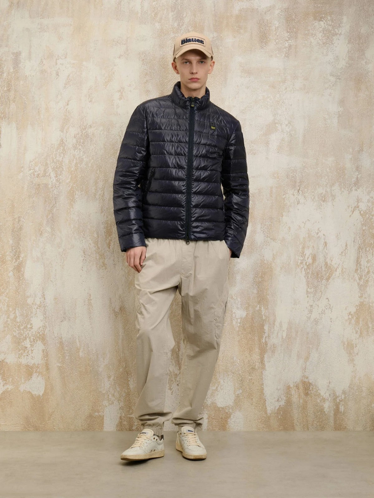 Piumino lucido BLAUER imbottito piuma e impunturato a righe orizzontali. Capo iconico della linea che non può mancare nel guardaroba.