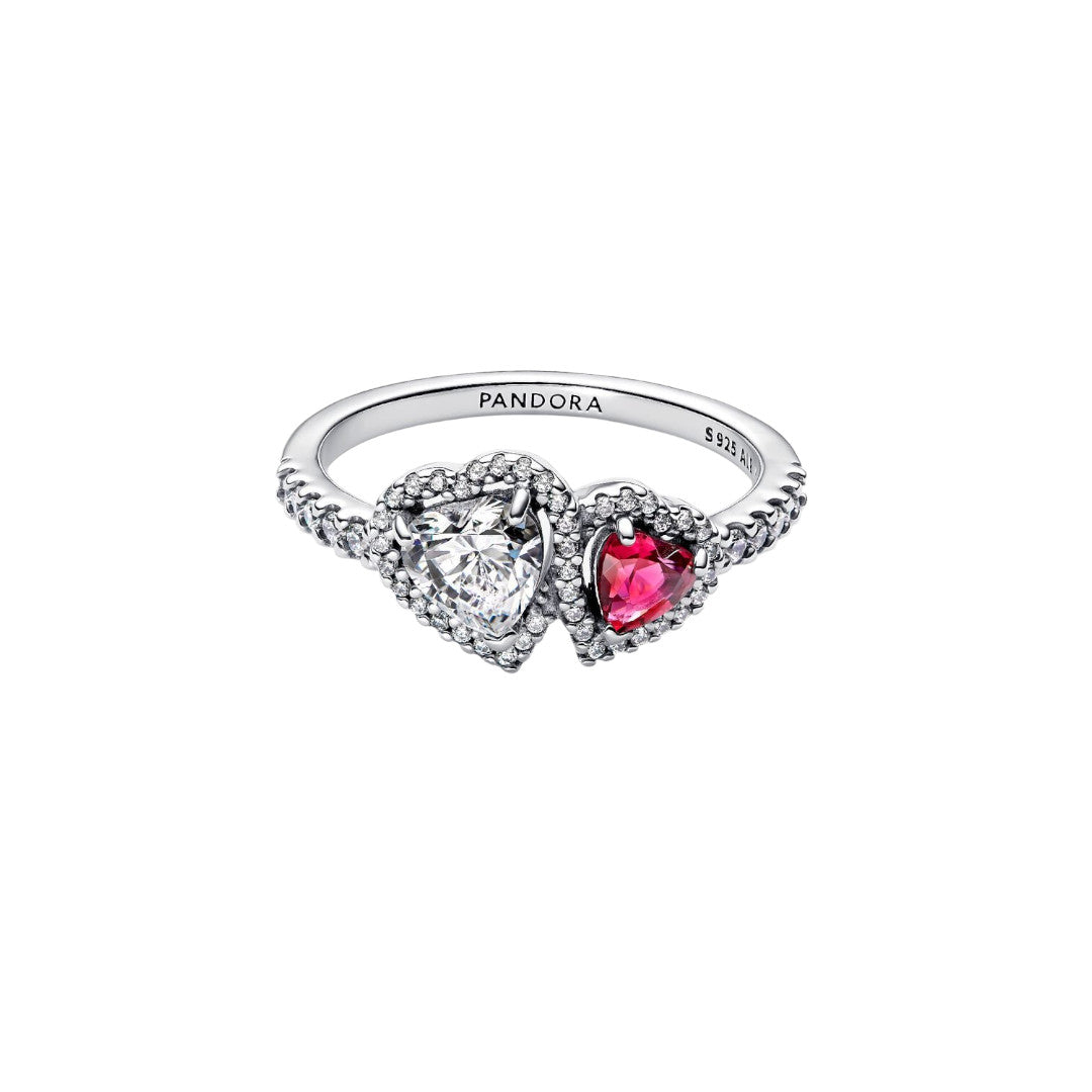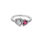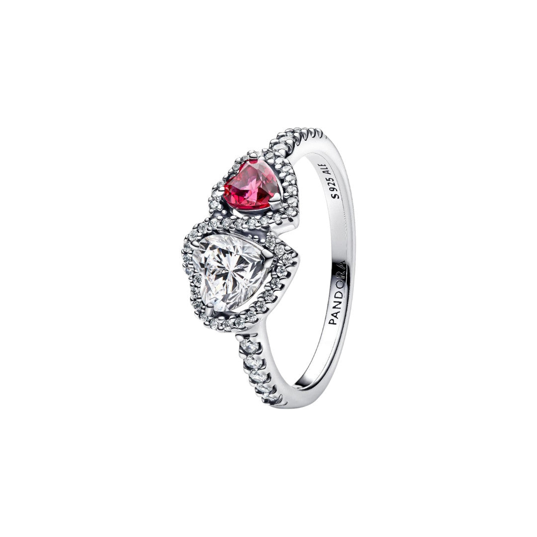 Anello a Cuori in Argento Sterling 925 con pietre di zirconia cubica incolore e cristallo rosso chiaro. I due cuori sono posizionati uno a fianco all'altro.