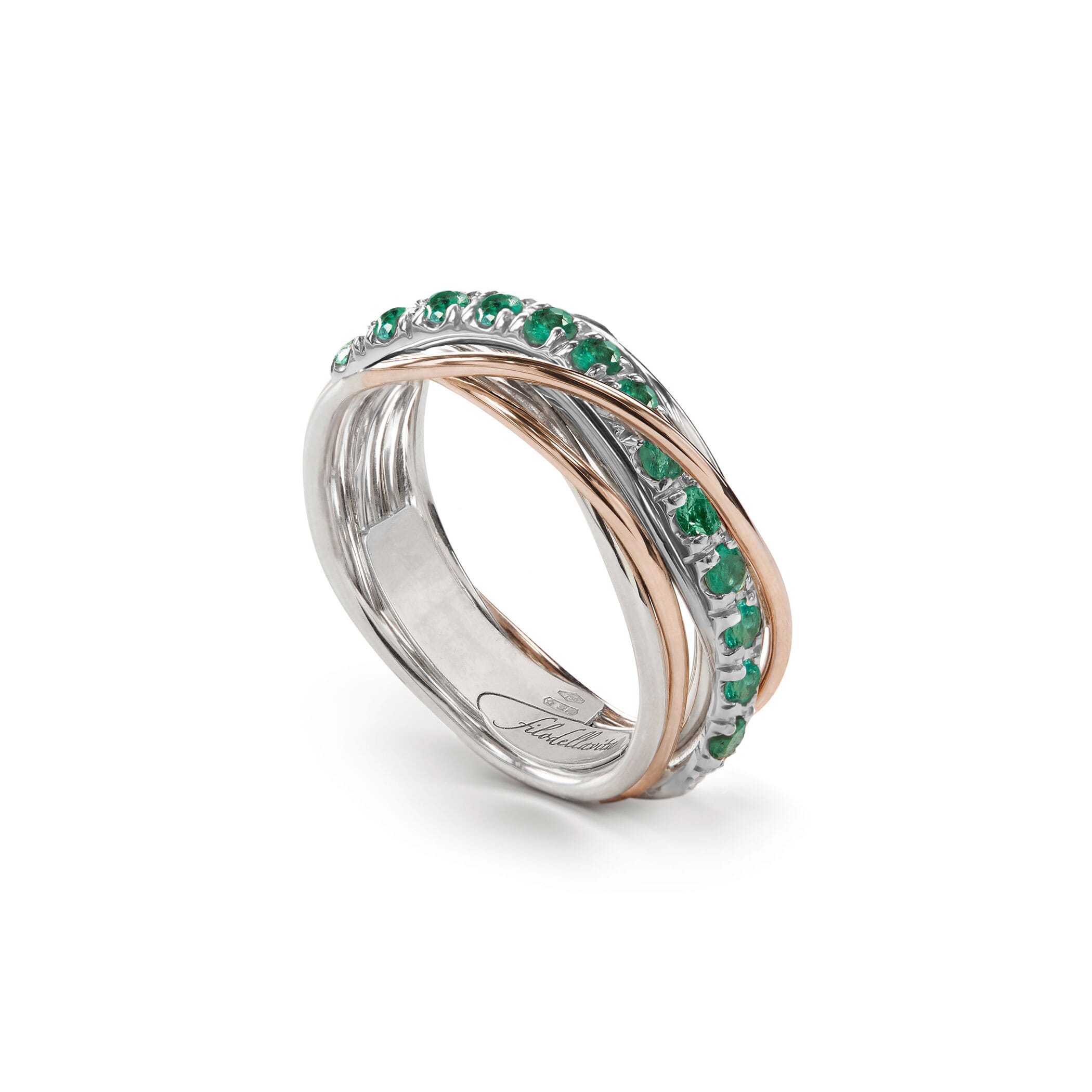 Anello Filodellavita Prezioso Collection, 7 Fili in Oro Rosa 9kt, Argento .950 al Palladio e 15 Smeraldi 0.65 ct tot.